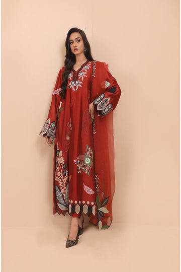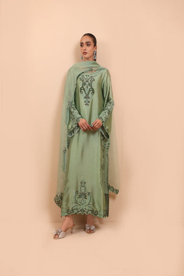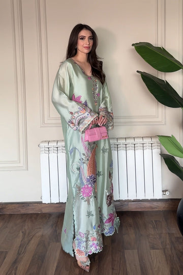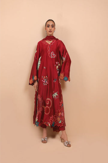 Details about the product: 3 Piece Pure Sheesha silk kaftan shirt with pants Multi resham embroidery appliqué...