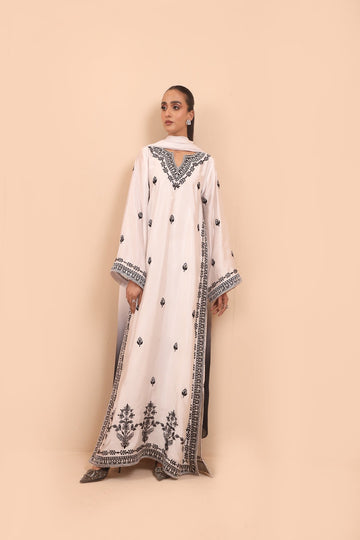Details about the product: 2 Piece Pure Sheesha silk kaftan Black and white resham embroidery...