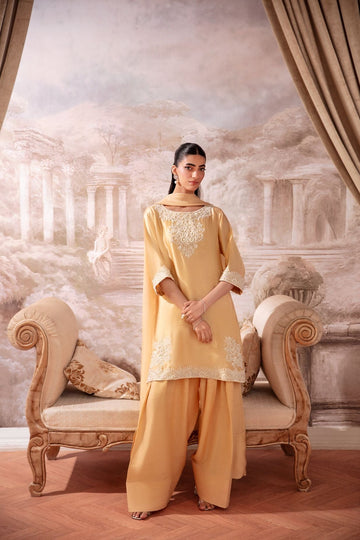 Details about the product: A 3pc set on sheesha Silk, embellished in cream pearls, sequins...