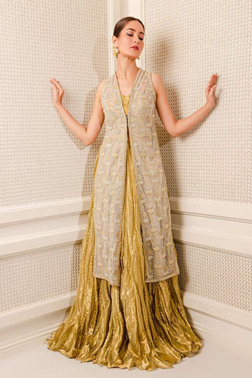 Details about the product: Pastel net Hand embellished gown paired with a printed organza flowy...