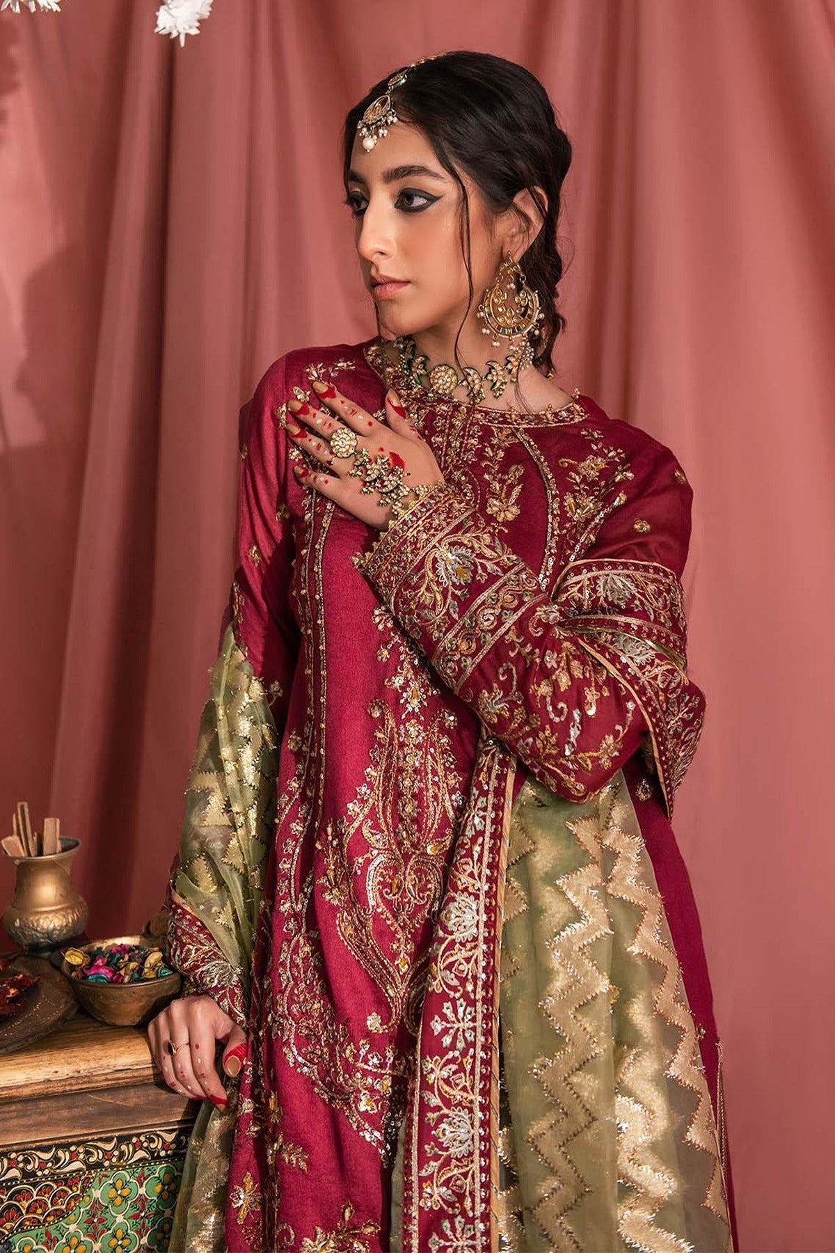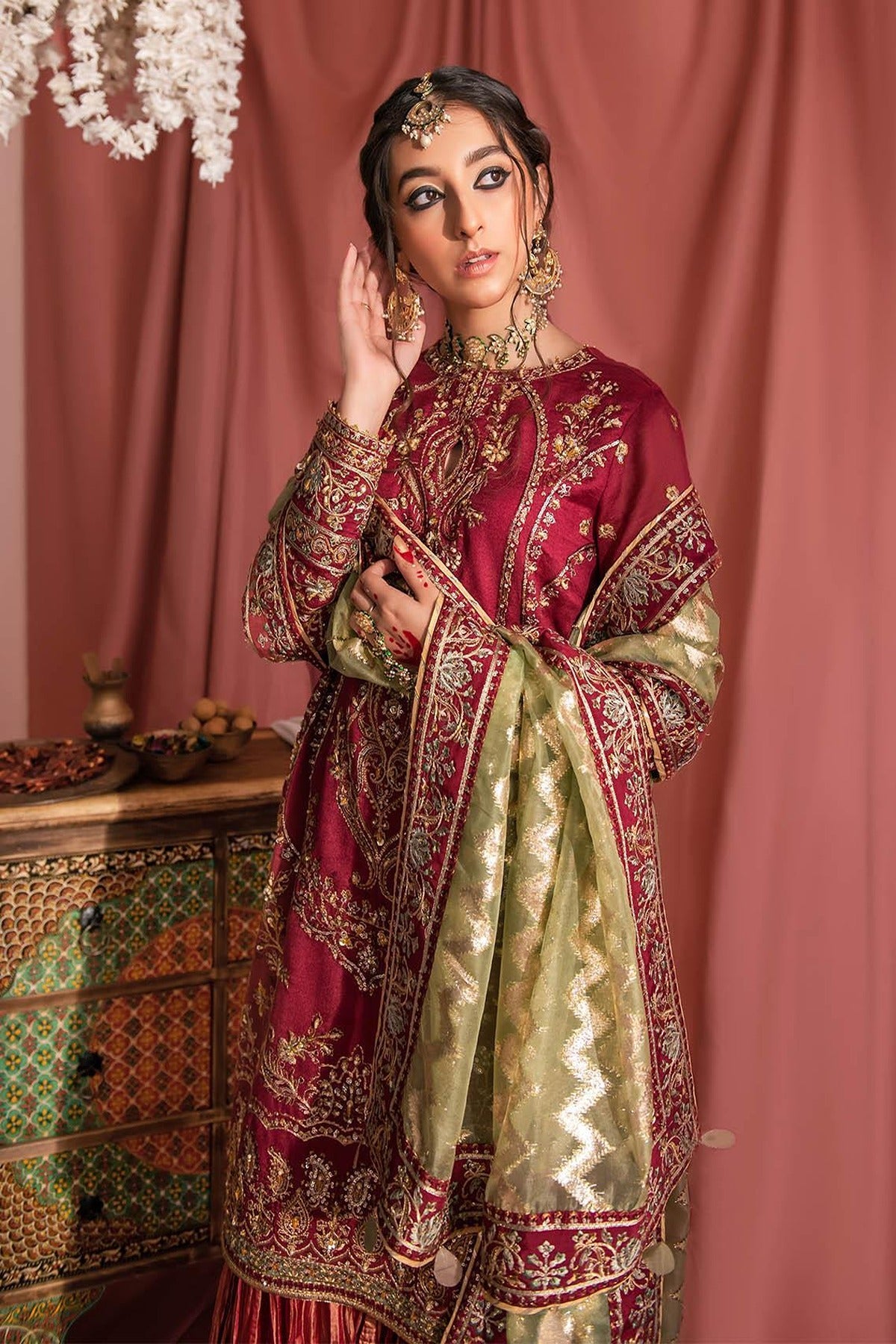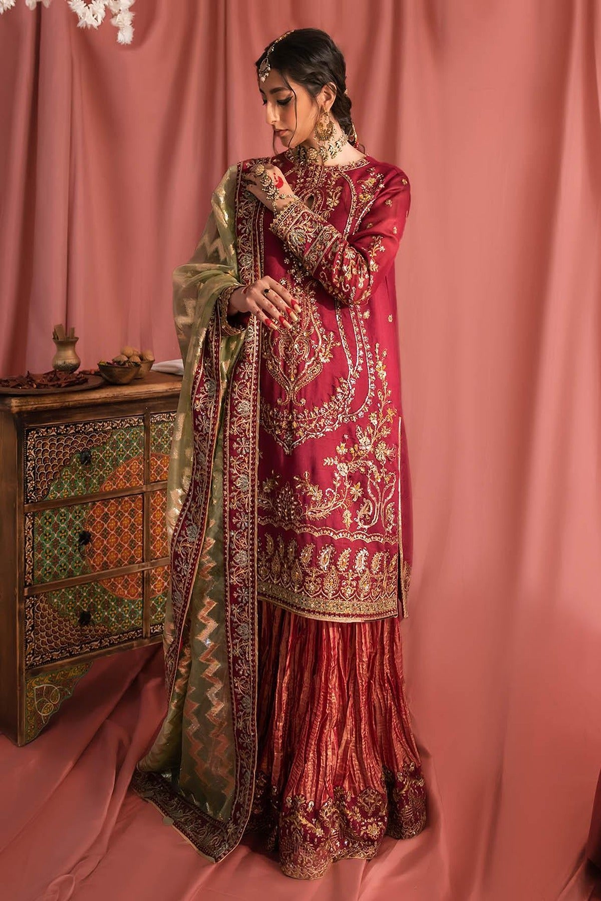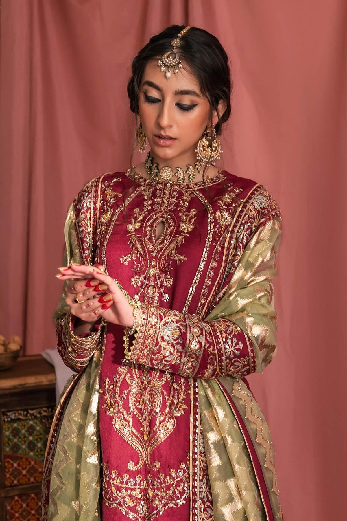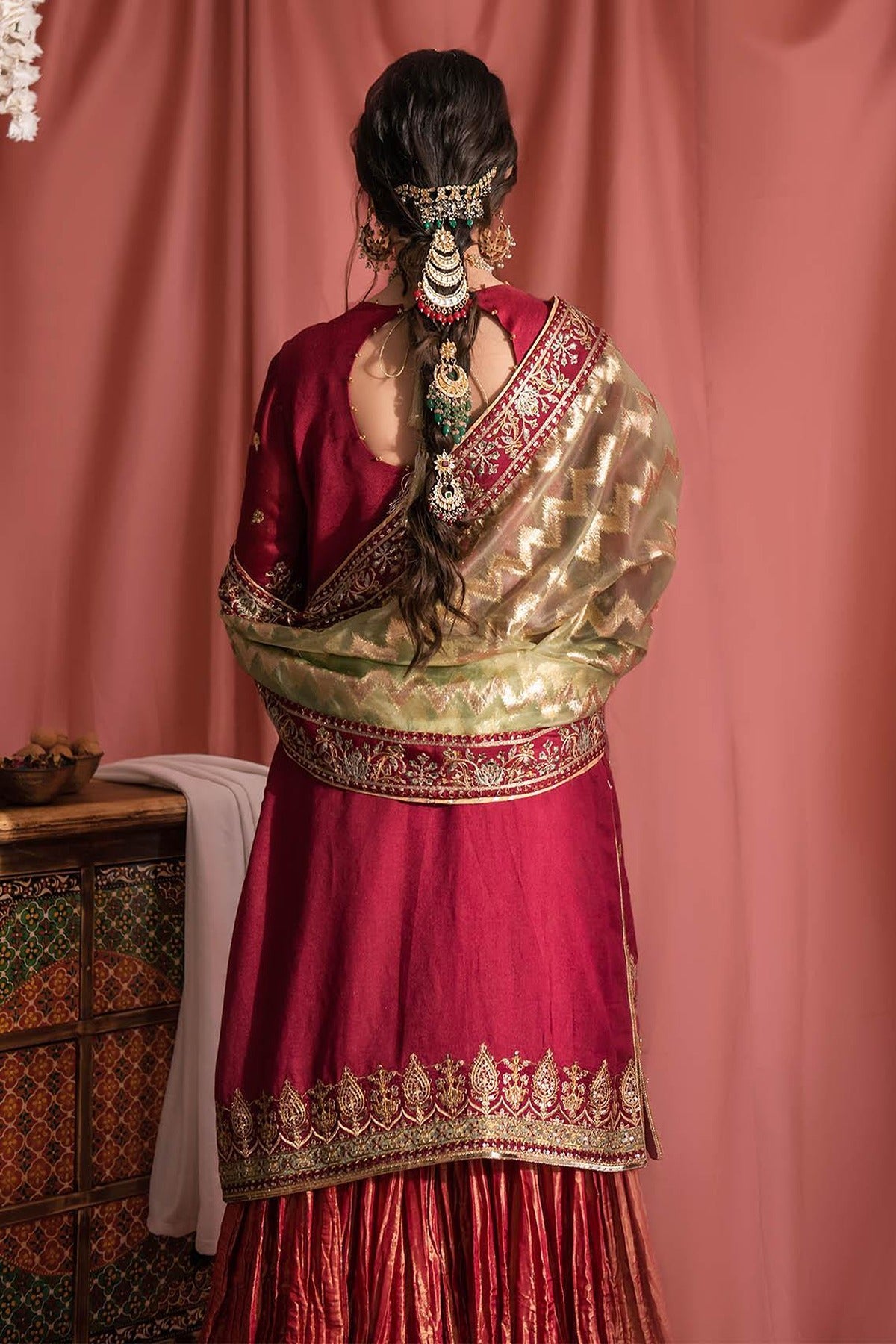 A deep magenta khaadi net canvas for the kameez with two toned light and antique gold embroideries and hand embellishments, reminiscent of Kashmiri papier mache a craft combining vibrant contrasting hues with metallics. Paired with the most breathtaking hue of silk lame pants, styled as a gharara and a sage green organza dupatta with a shimmering metallic pattern.
