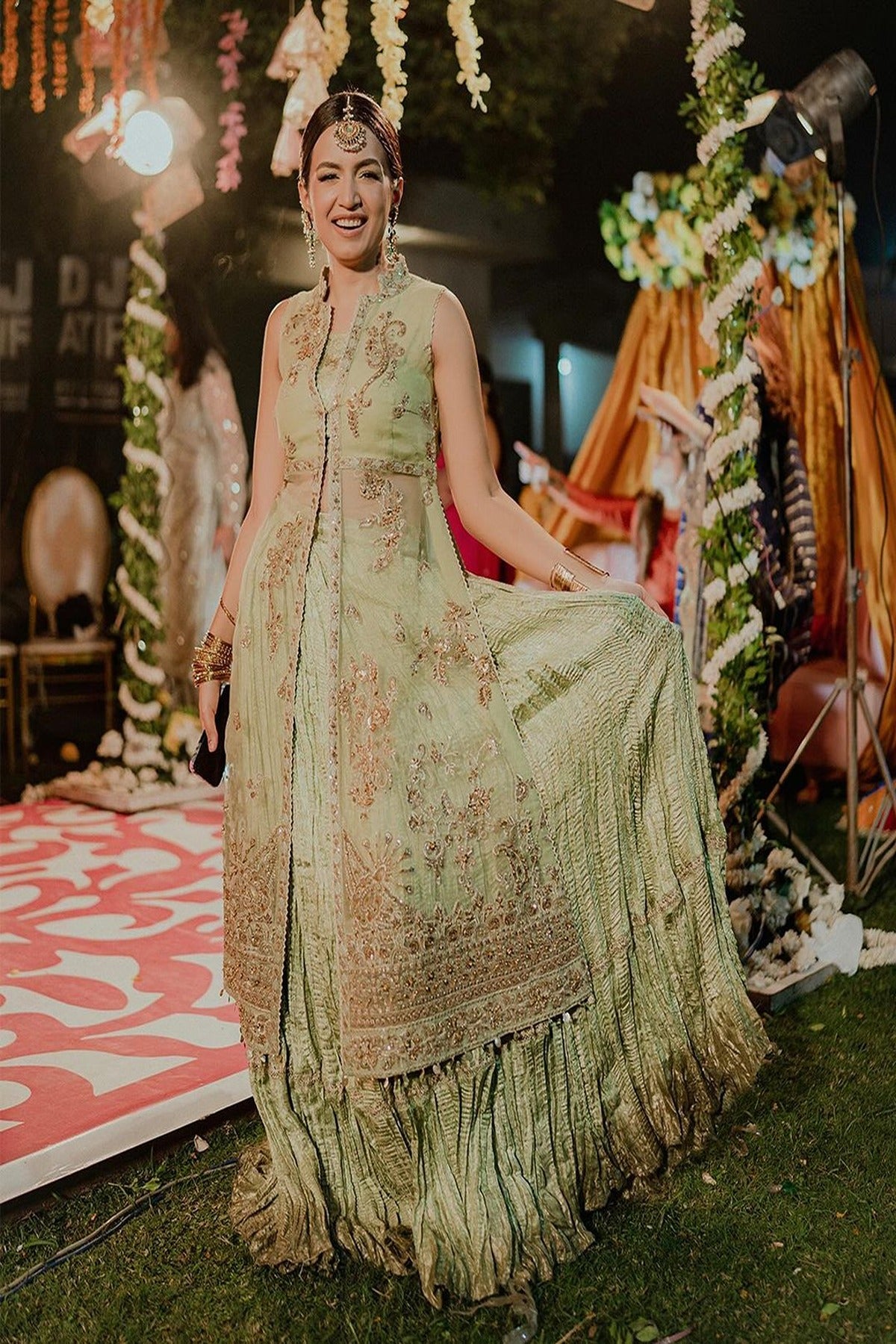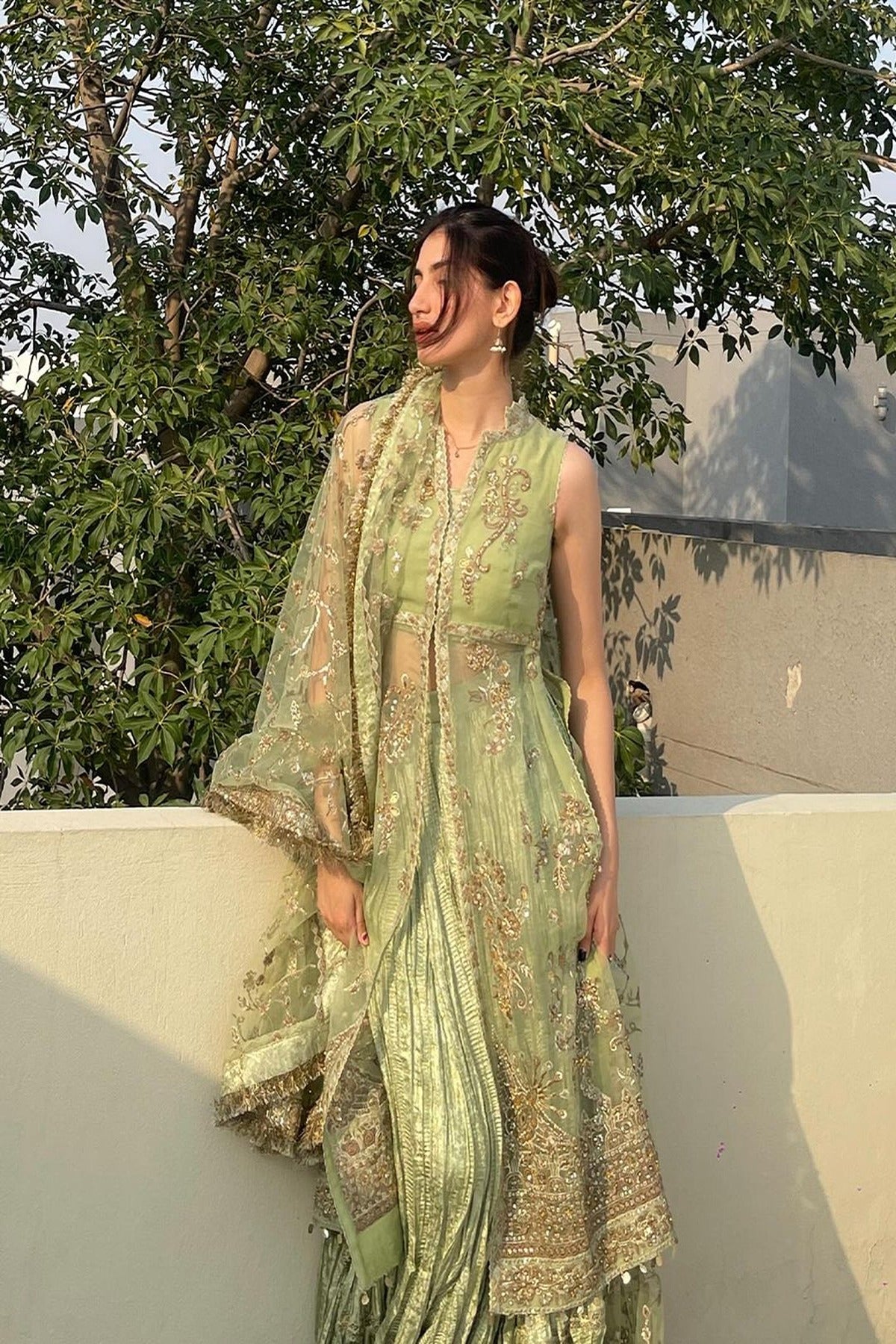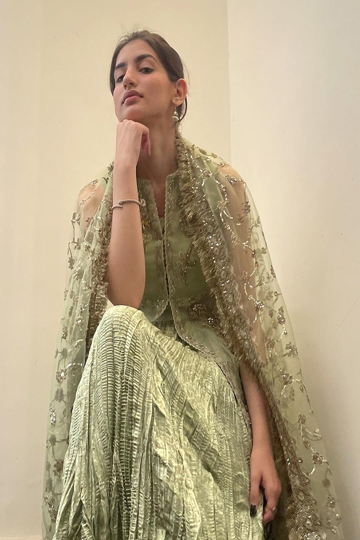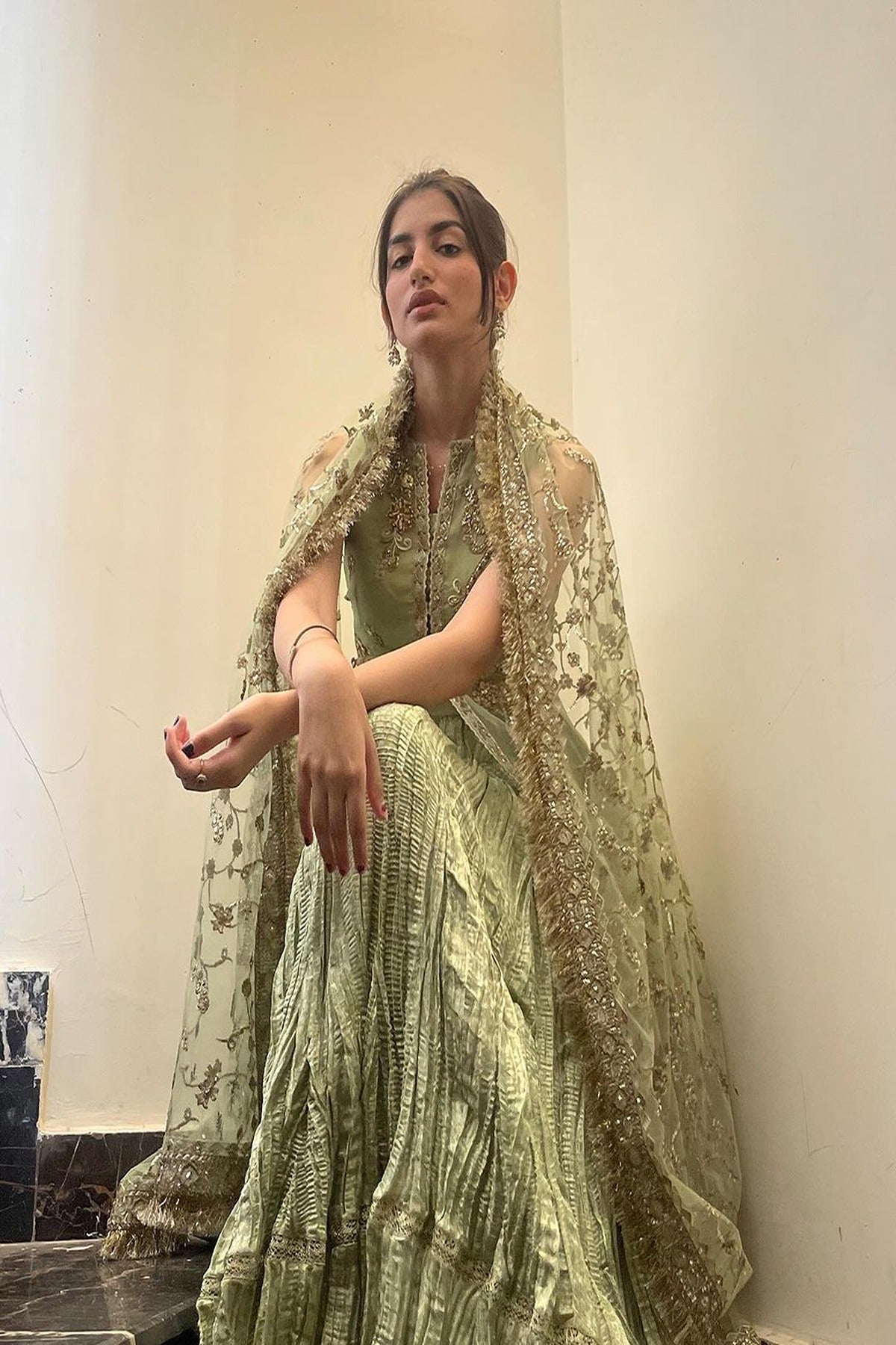 An enchanting chartreuse organza base in a harmonious fusion of understated elegance. Free-flowing and organic adornments of gold-dipped embroideries are composed on the shirt, with bronzed beads and crystals used to hand embellish the motifs. The pièce de résistance lies in the border, laden with lavish embellishments, reminiscent of antique craftsmanship decorate the ensemble, crafting a striking contrast against the soothing green palette.
