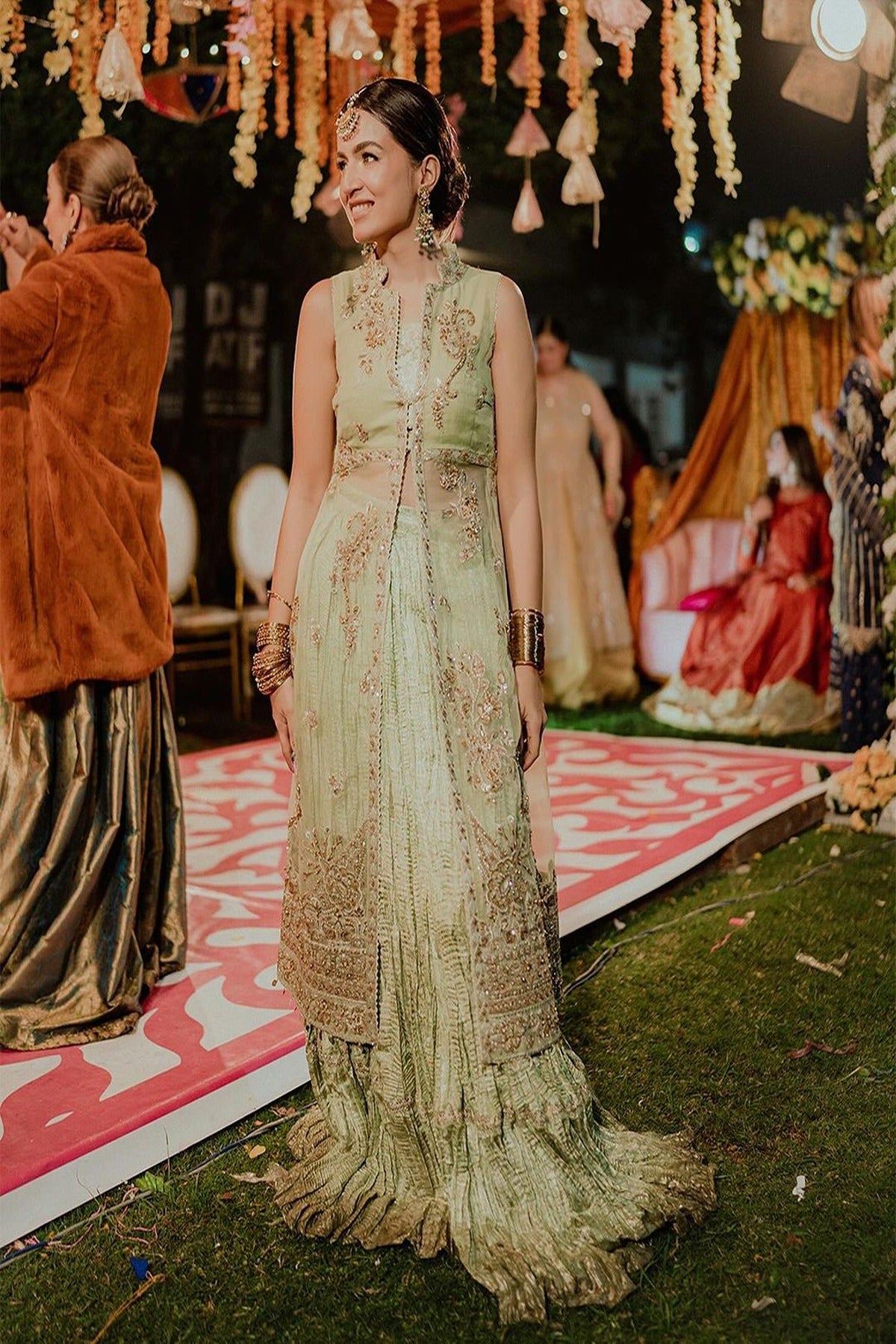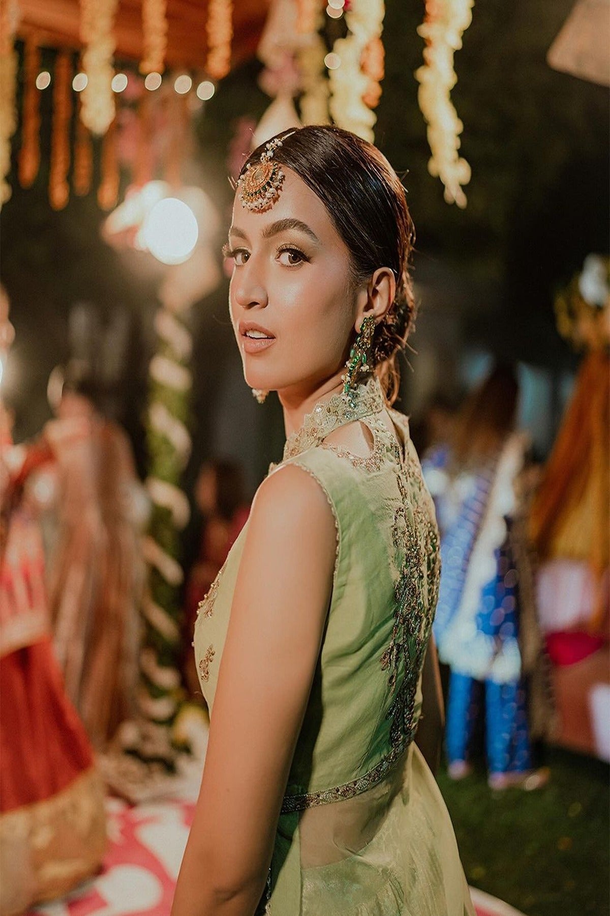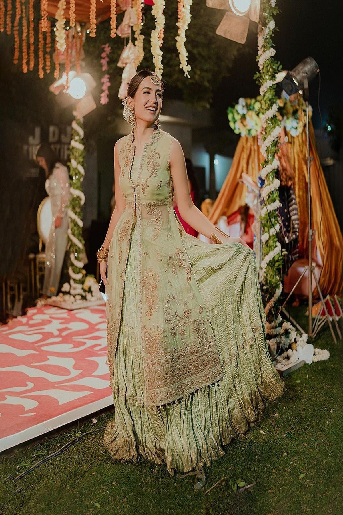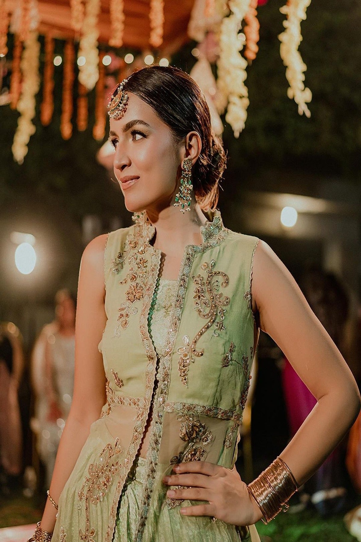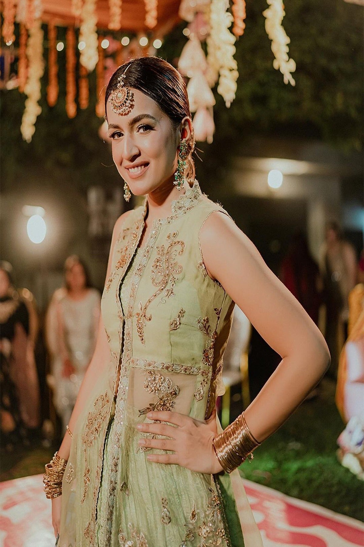 An enchanting chartreuse organza base in a harmonious fusion of understated elegance. Free-flowing and organic adornments of gold-dipped embroideries are composed on the shirt, with bronzed beads and crystals used to hand embellish the motifs. The pièce de résistance lies in the border, laden with lavish embellishments, reminiscent of antique craftsmanship decorate the ensemble, crafting a striking contrast against the soothing green palette.