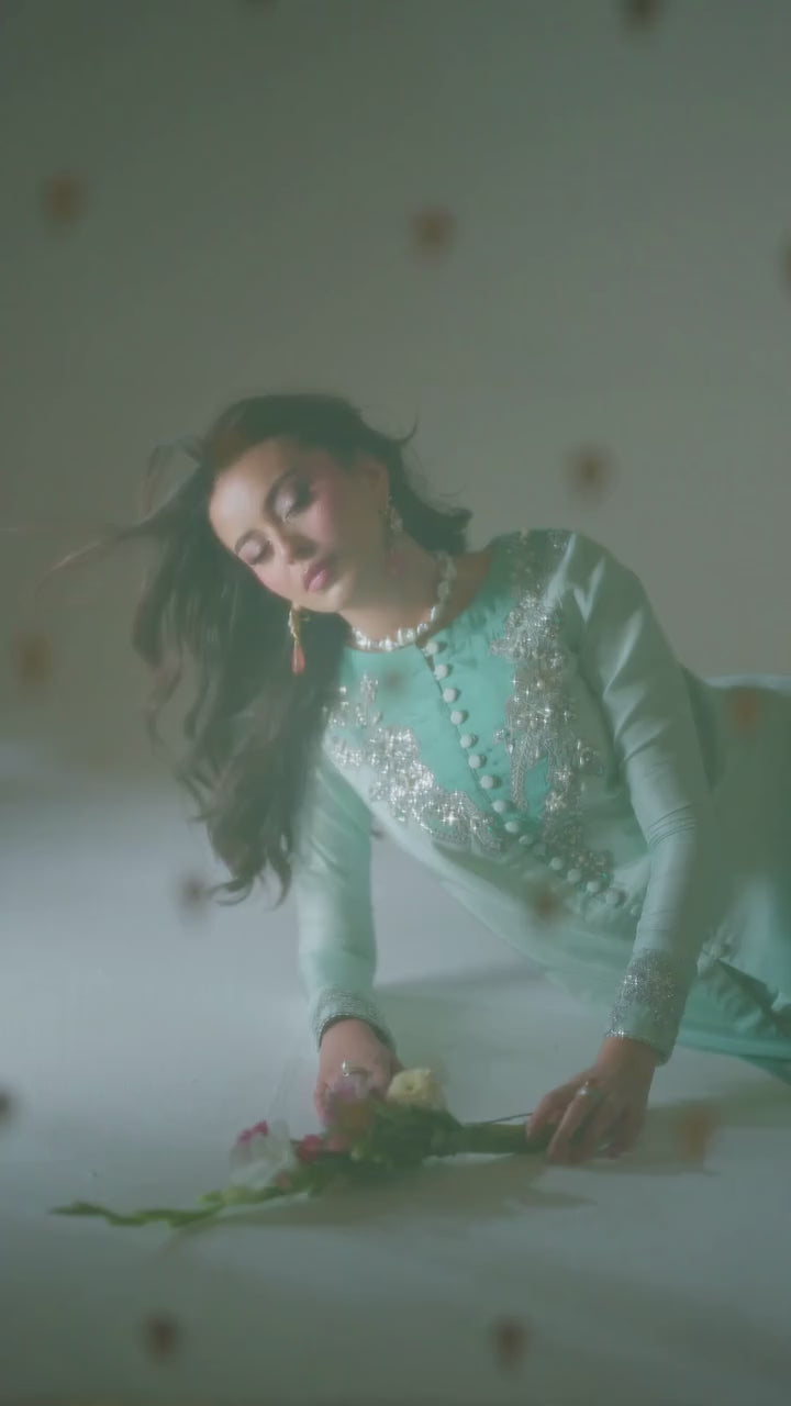 - Dive into serenity with "HARMONY"! This ombre tussle silk outfit, dyed in a mesmerizing turquoise gradient, is pure elegance. The front-open shirt features delicate loop button details, while the sequin-embroidered and hand-embellished neckline and daman side motifs add a touch of sparkle. The sleeves are finished with an embroidered border, paired with sleek straight pants and an ethereal organza embroidered dupatta. Feel the harmony of style and grace.