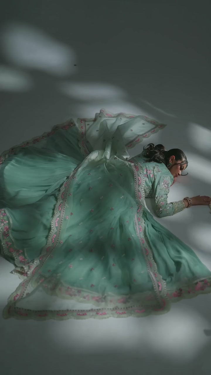 Pistachio perfection! The Satin Serenity outfit is the perfect mint dream. The Korean raw silk body and sleeves are embellished with resham thread, sequin, cutdana, Swarovski crystals, and dabka. The grand chiffon flair, with its own embroidered border and inner silk layer, is paired with an organza embroidered border.