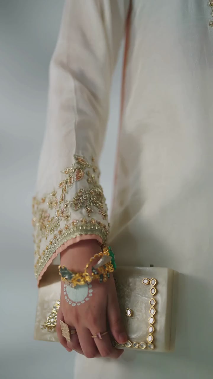 Ethereal elegance in Silk Whisper. This off-white silk ensemble features a Resham and sequin embellished neckline and sleeves border. The loose pants are finished with an embroidered border, and the printed organza dupatta is adorned with a pearl and gotta spray.