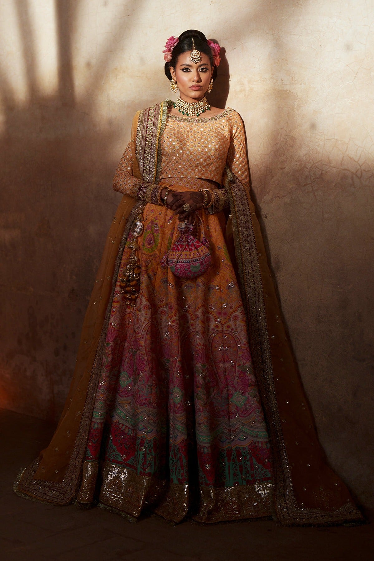 Printed mustard rawsilk blouse with hand-applied sequins, embroidered neckline, and layered sleeve borders. Fourteen printed lehnga panels shimmer with sequins, enhanced by a heavily embroidered mustard silk border. Completed with an organza dupatta featuring sequin sprays and magenta embroidery, Aab-e-Zar is radiant craftsmanship designed to captivate every festive moment.