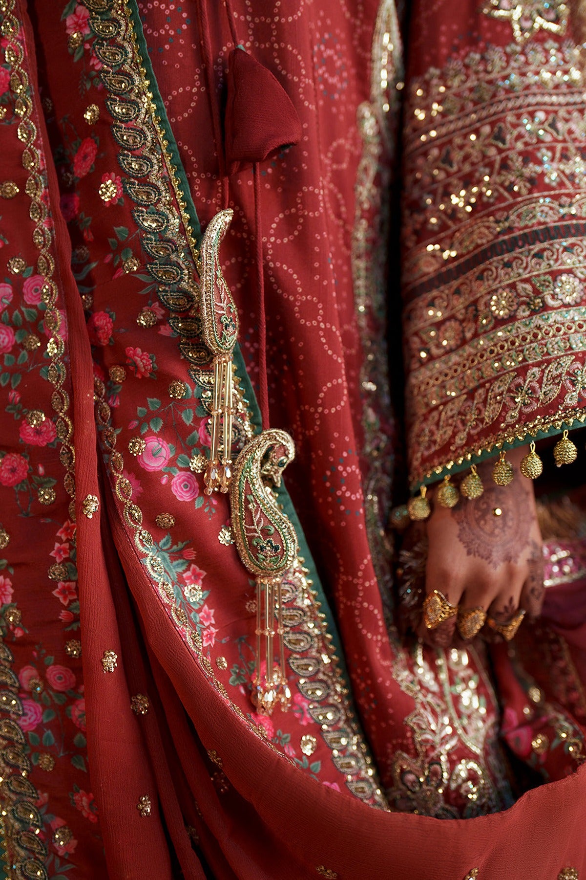 Paisleys and florals intertwine along the rawsilk kameez, complemented by an embroidered neckline and intricately bordered sleeves. Dyed silk trousers echo the elegance with finished borders, while a chiffon dupatta, enriched with sequin chan detailing and embroidered edges, flows like a whispered ode to refined artistry.