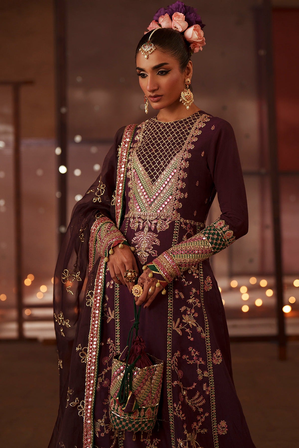 Dark plum rawsilk kalidar with embroidered yoke, bold center daman motif, floral side panels, and delicate sprays. Three contrasting borders frame the hem, while chatta-patti sleeves add finesse. Dyed churidar trousers and an organza dupatta with green pallu borders complete a look of timeless sophistication and graceful movement.