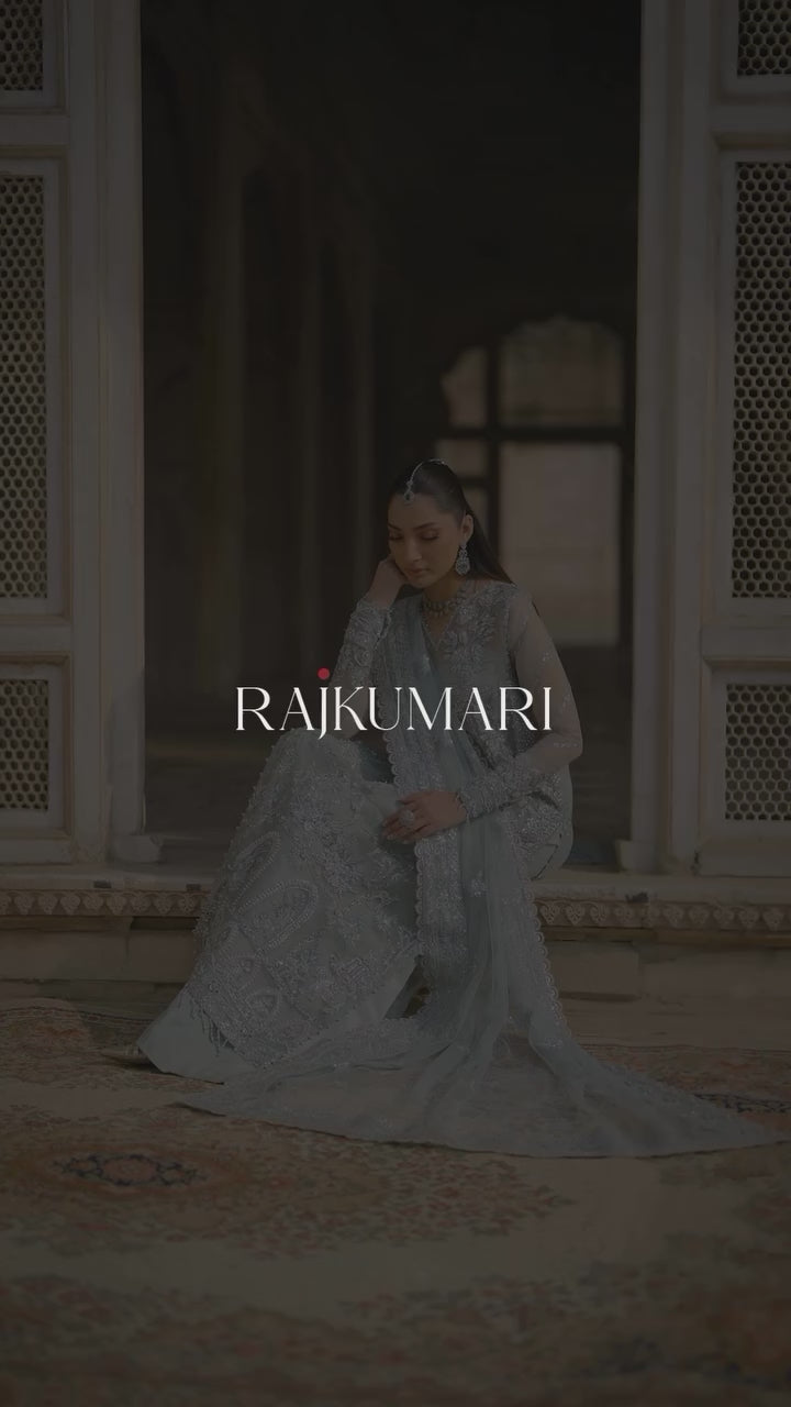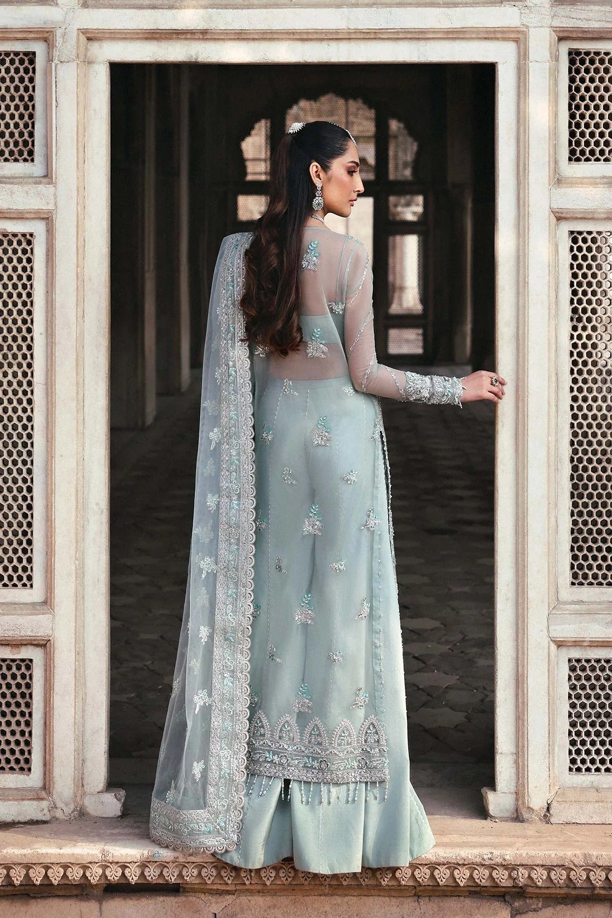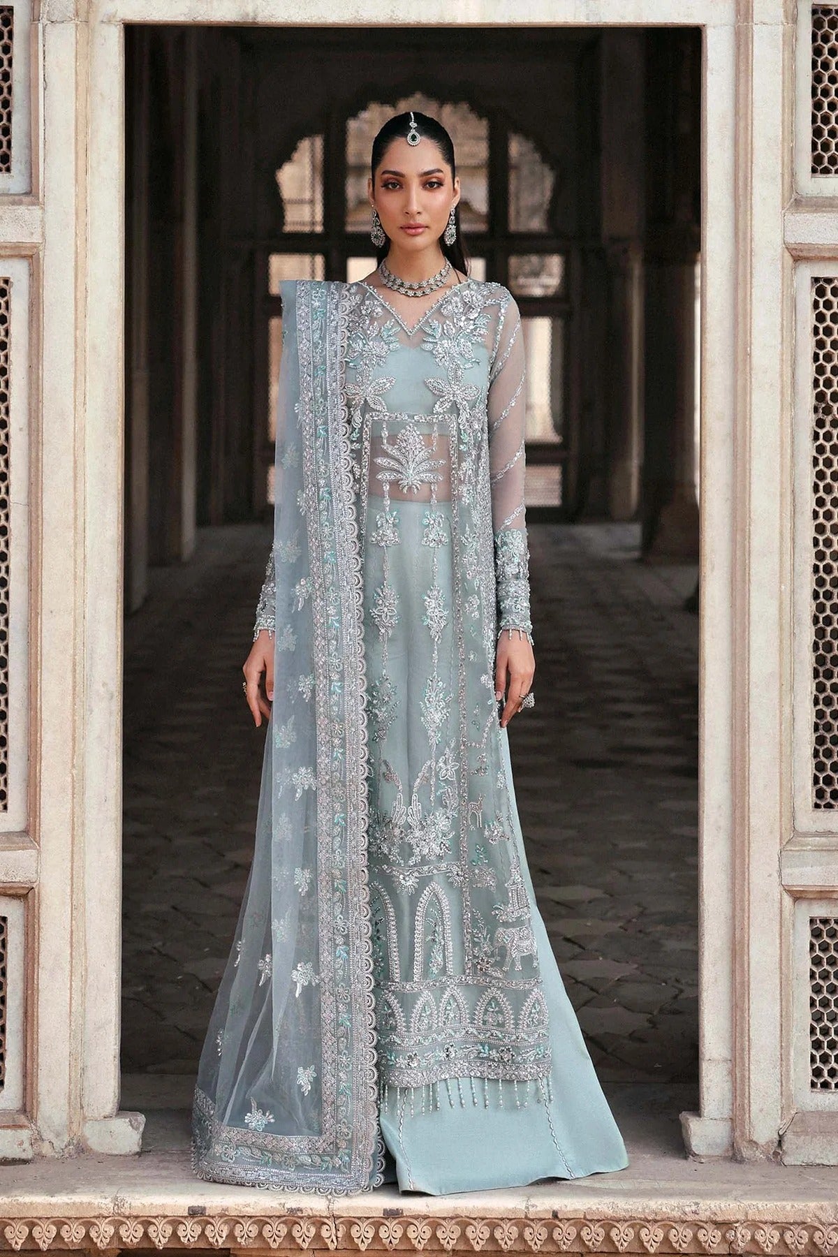 The outfit is a stunning, intricately embroidered pastel blue ensemble with a traditional silhouette. It features a long, sheer-sleeved kameez adorned with delicate silver embroidery and floral motifs. The flowing dupatta is embellished with intricate embellishments and a scalloped lace border, draping elegantly over the outfit. The ensemble is completed with a matching lehenga or flared trousers, enhancing its regal charm.