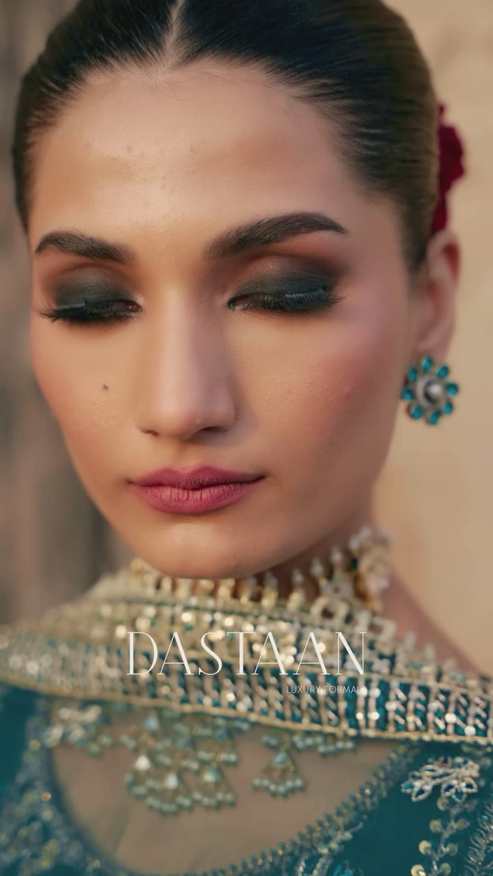 A regal deep teal ensemble, adorned with intricate gold embroidery and delicate embellishments. The grandeur of this piece echoes heritage craftsmanship, making it a timeless statement for the festive season.