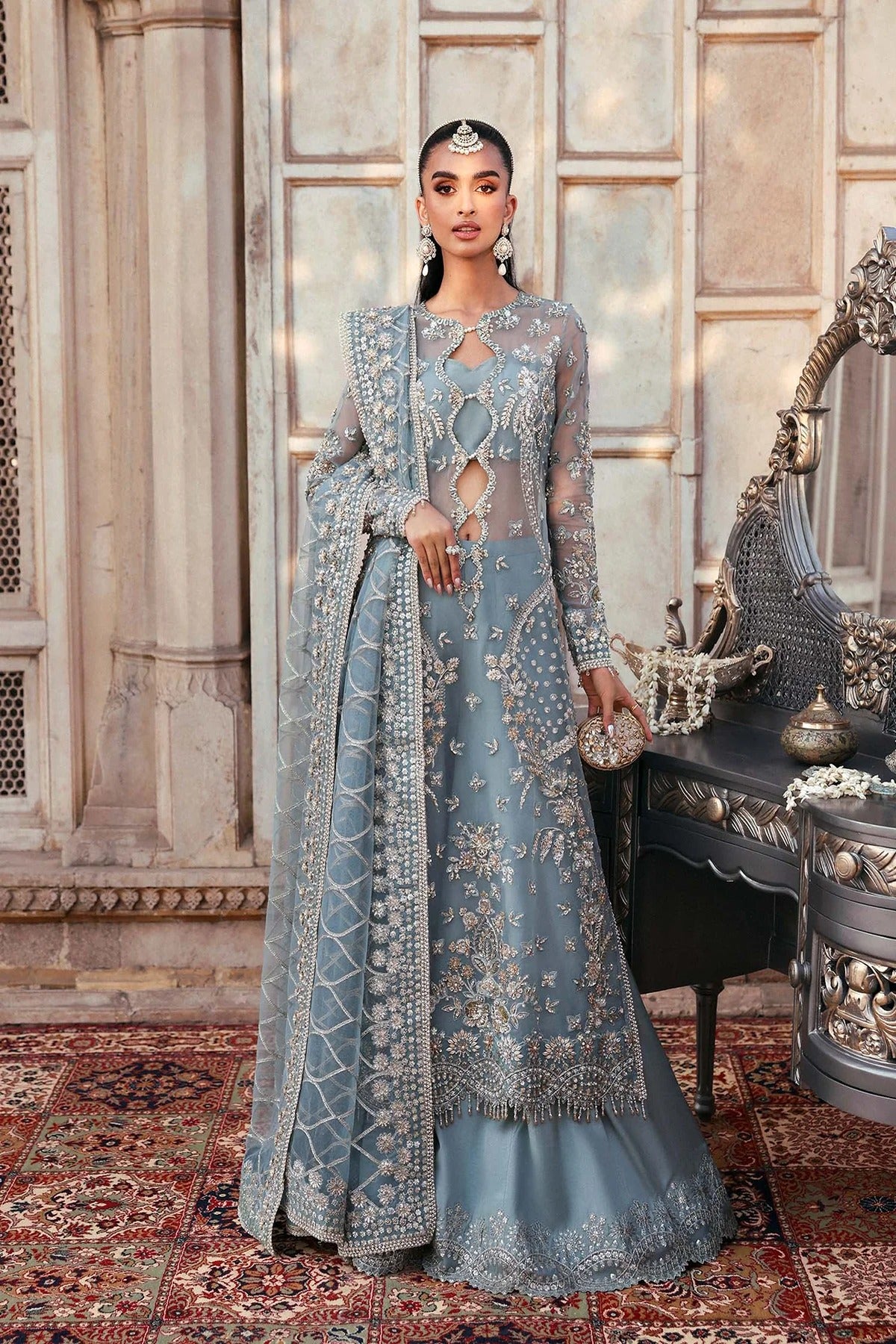 A pastel blue lehenga with intricate silver embroidery, featuring a sheer blouse with full sleeves and a scalloped hem. A matching dupatta, richly embellished and draped over one shoulder, adds elegance. The look is completed with a coordinating embellished clutch.