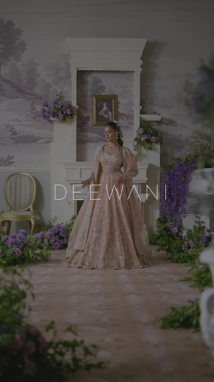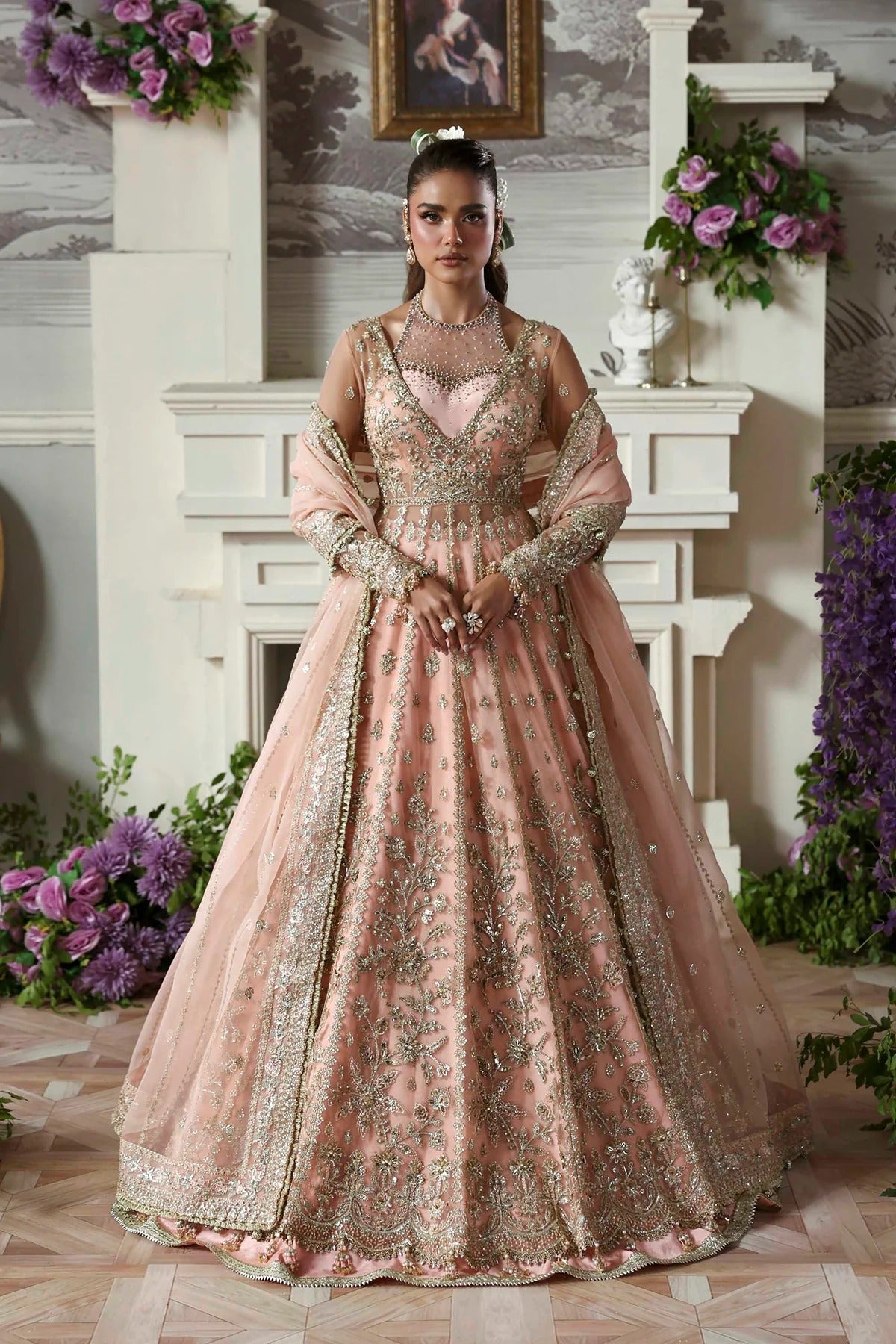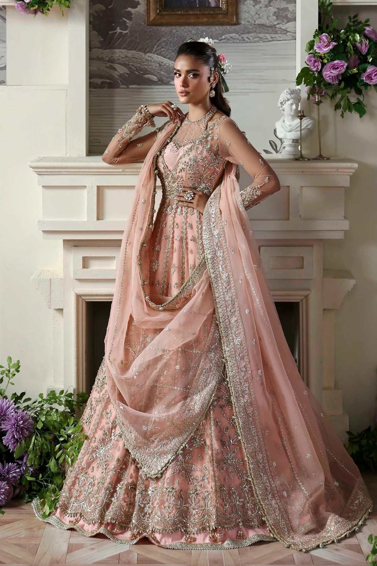 A soft blush pink outfit adorned with delicate silver and gold embroidery. Sanoura exudes a sense of softness, luxury, and grace, making it an ideal choice for a bridal lehenga or a festive event where elegance is key.