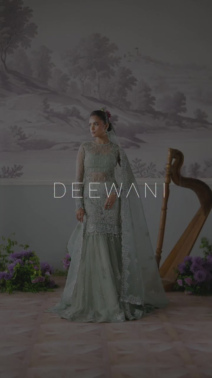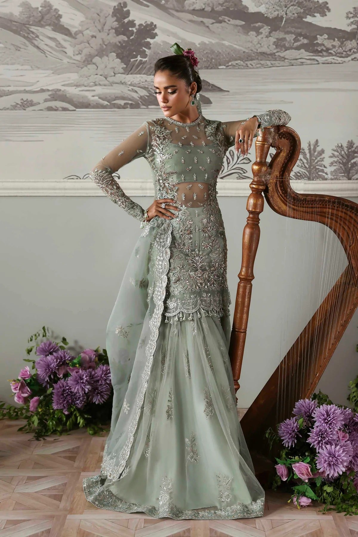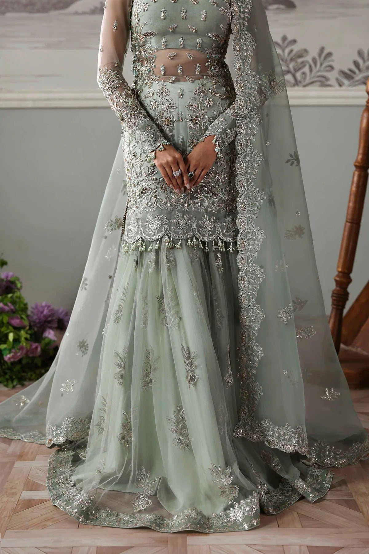 Silvenza features a mermaid-style silhouette in soft mint with silver embellishments. The sheer sleeves and flowy structure make it graceful, modern, and ideal for receptions or dreamy daytime occasions.