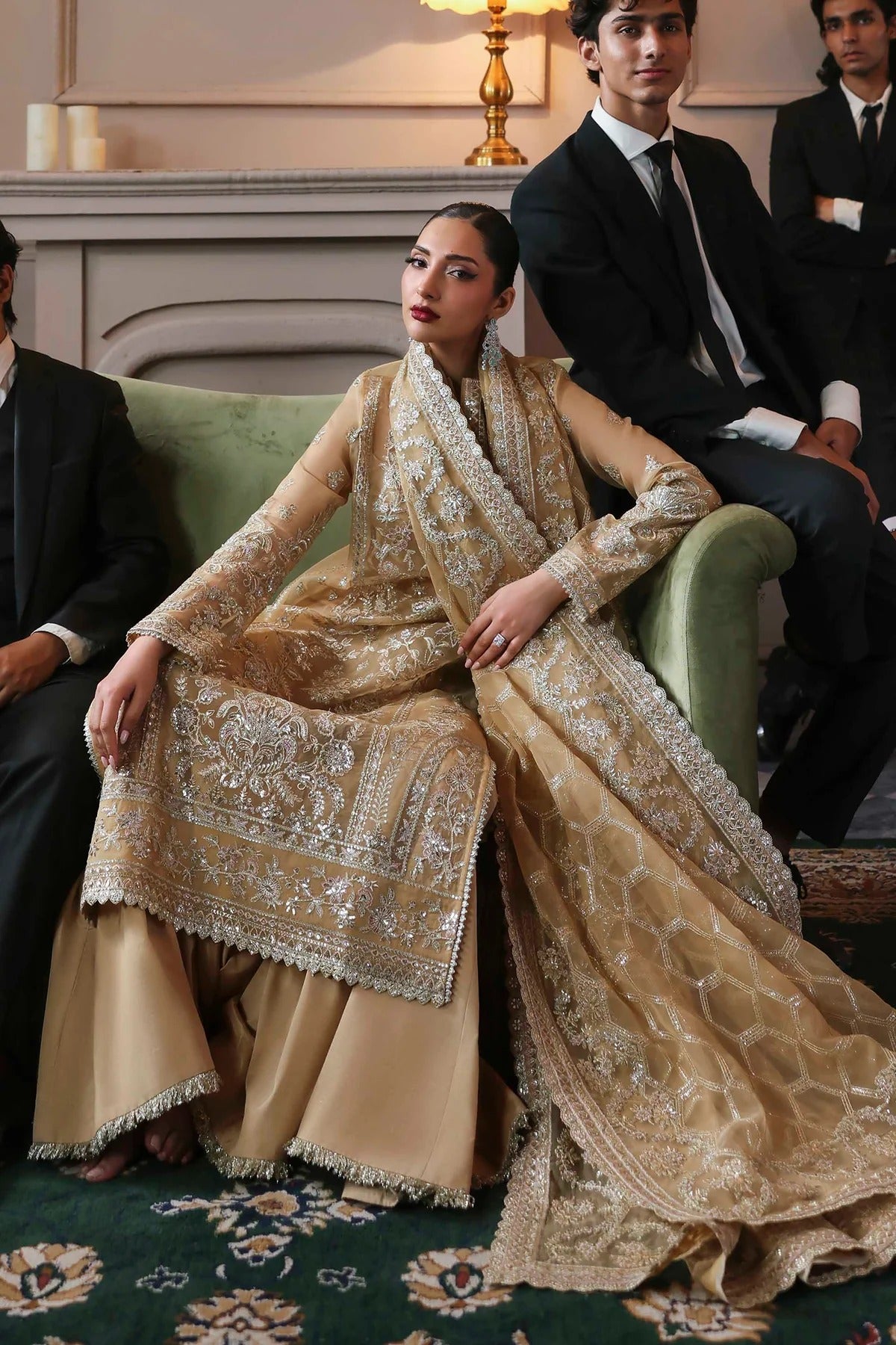 An opulent gold outfit adorned with detailed embroidery, reflecting grandeur at every glance. Its majestic aura is balanced with modern sophistication. A true couture piece made for regal celebrations.