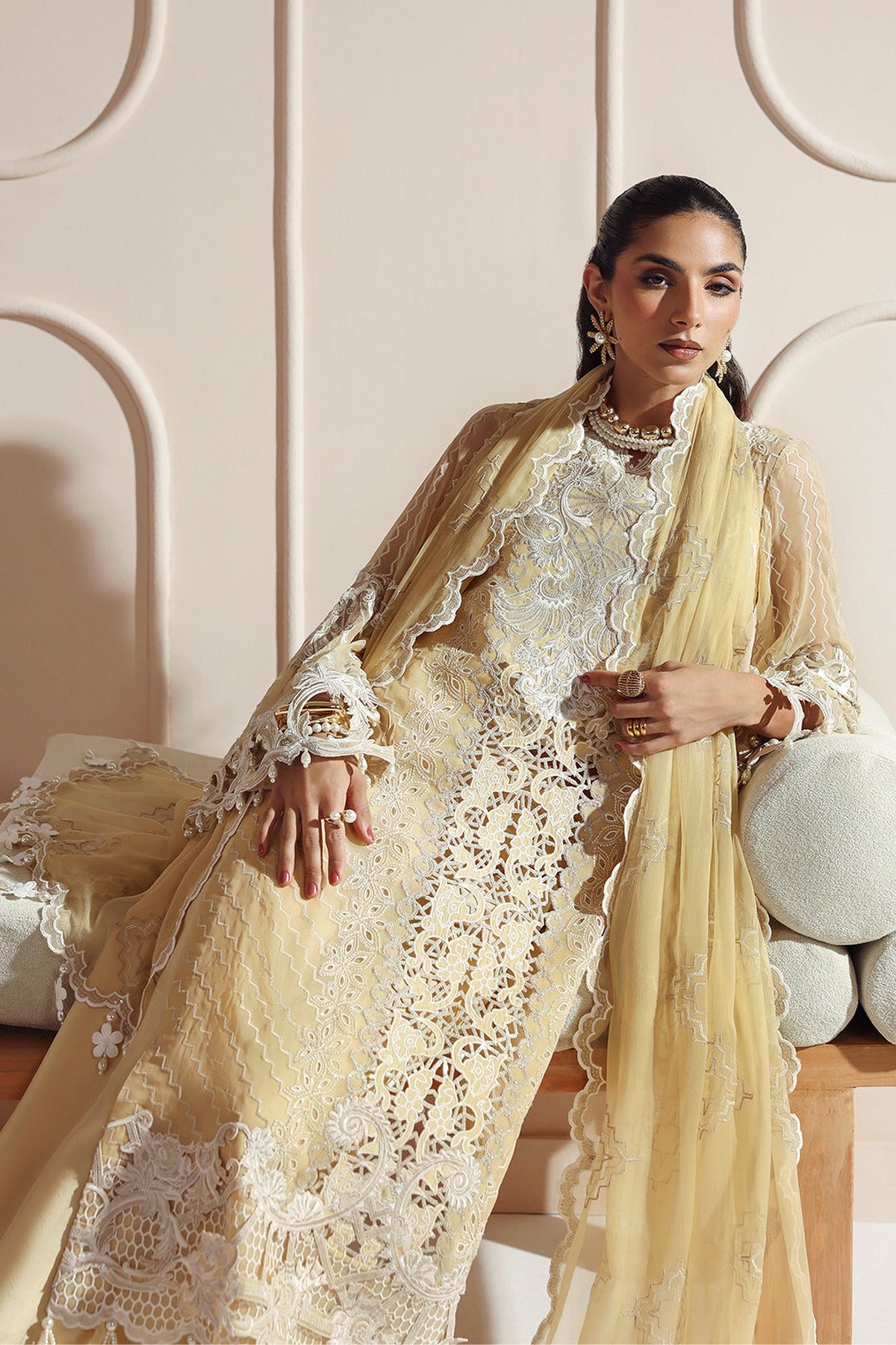 A cream-yellow ensemble with embroidered viscose front panel, rich with white detailing. The graceful silhouette is further enhanced by flowing chiffon for the front, back, and sleeves, lending an ethereal quality. A sophisticated high, round neckline is delicately framed by complementary embroidery which extends gracefully across the front. The sleeves a, presenting a flared, bell-like cut adorned with matching embroidery, cutwork, and elegant tassels.