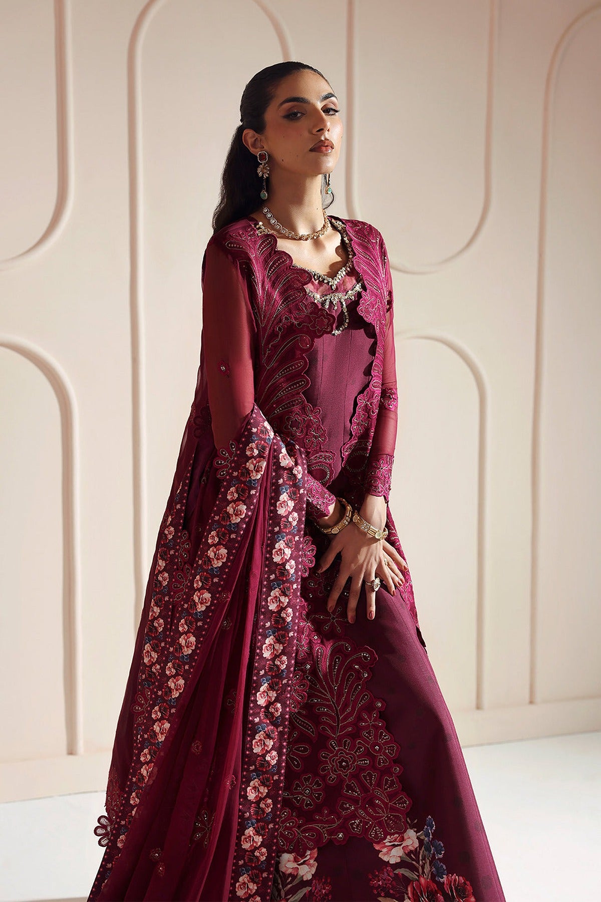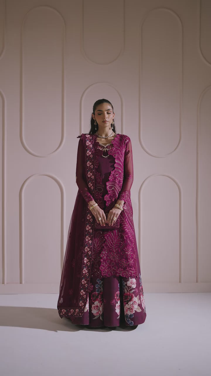 An opulent ensemble in a deep wine hue, long-line silhouette is designed for a dramatic yet graceful presence. It includes a floor-length dress and a matching open gown, both richly embellished with tonal embroidery that adds luxurious texture. Large, detailed floral motifs in soft pinks, white, and green beautifully bloom across the lower portion of the dress.. A matching dupatta with a wide, embroidered border drapes gracefully, completing the elegant and memorable look.