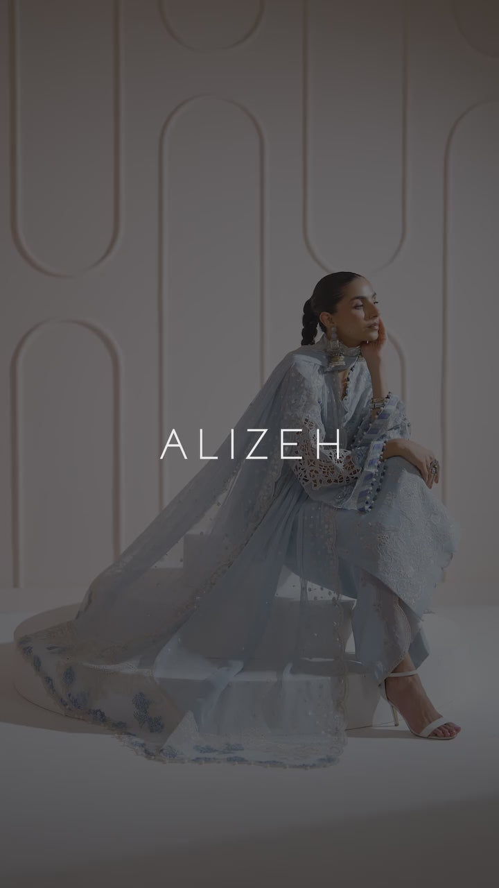 A serene, light blue gown features a deep V-neckline, gracefully adorned with intricate embroidery in coordinating shades of blue and silver. The sleeves, a standout feature, are crafted from a delicate, bamber chiffon fabric with elegant cutwork, imparting an ethereal and sophisticated charm to the outfit. Harmoniously blends soft color with meticulous craftsmanship.