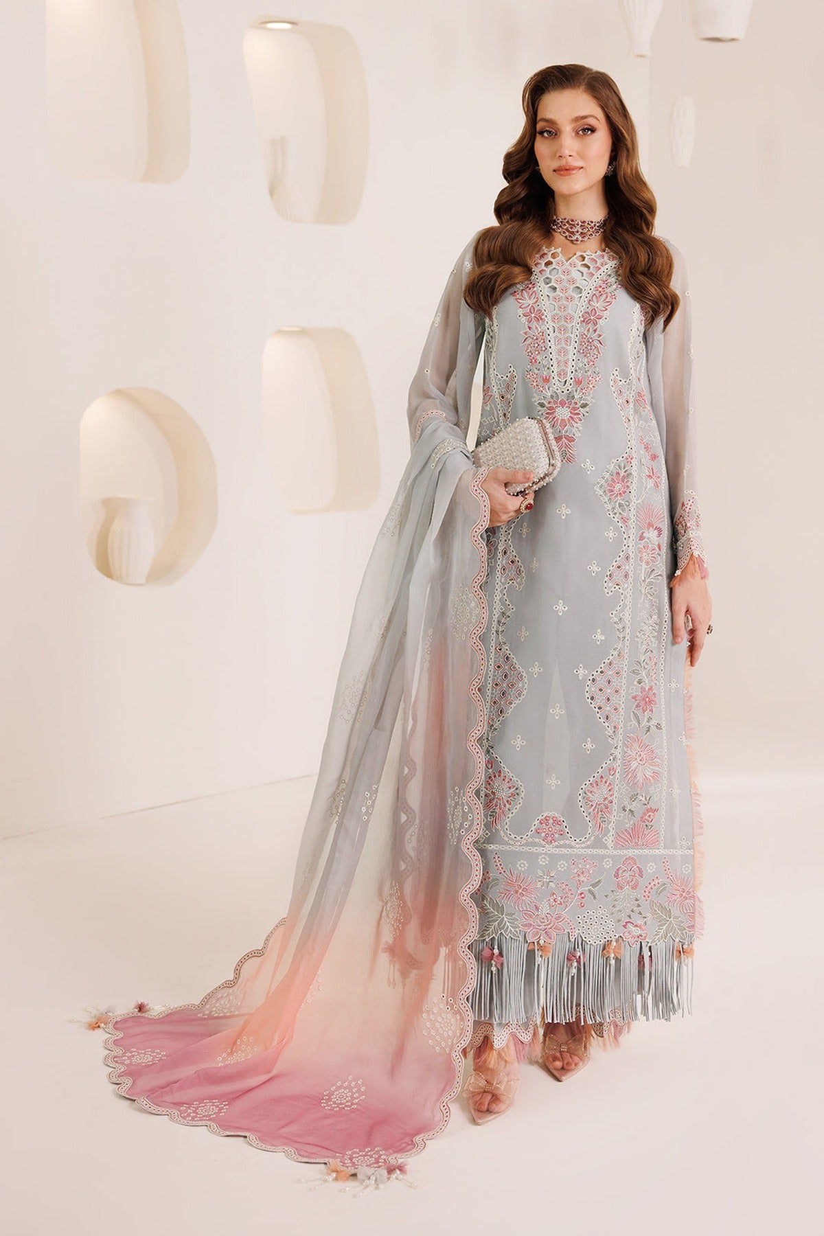 A whisper of lilac in every thread – This embroidered chiffon shirt, featuring tonal embroidery in a vibrant hue, is styled with a beautifully contrasting embroidered dupatta, shaded in pastel tones that blend seamlessly with the ensemble. It is paired with elegant raw silk trousers for a refined, graceful look.
