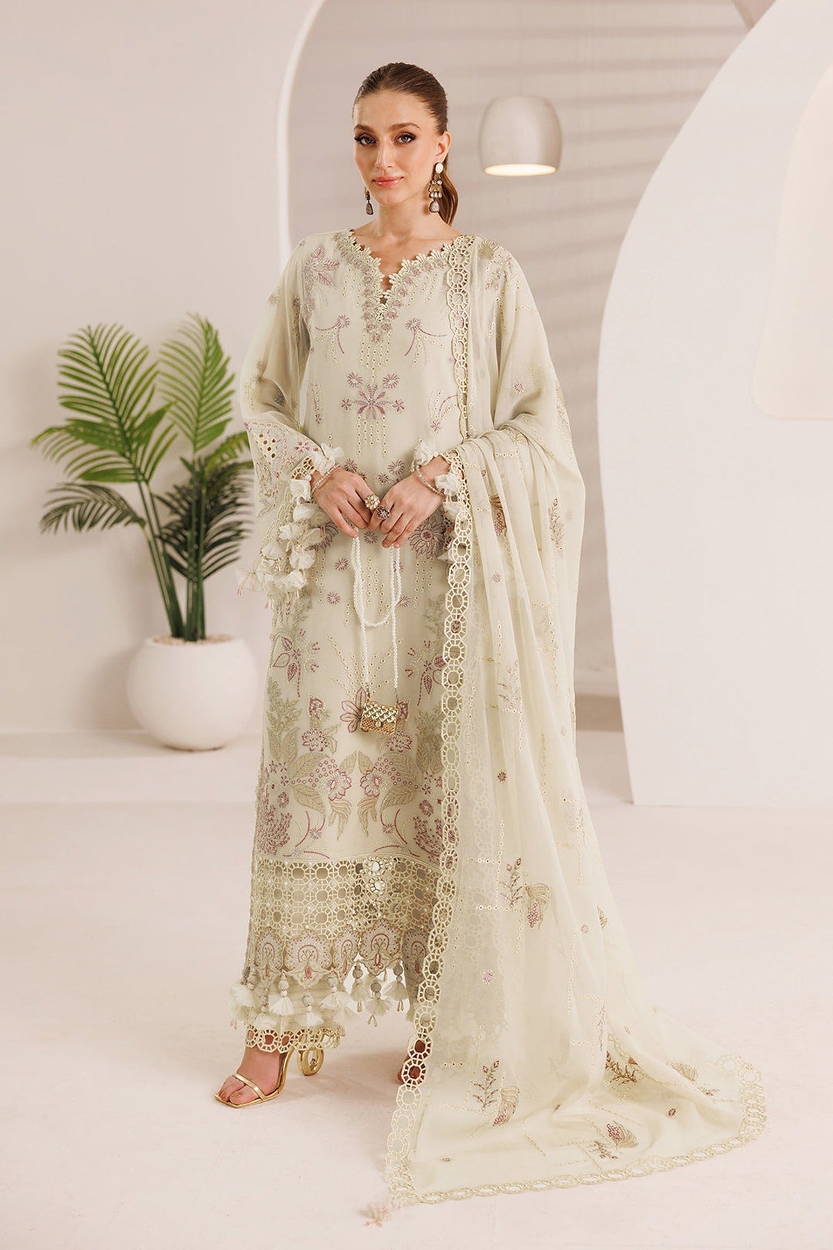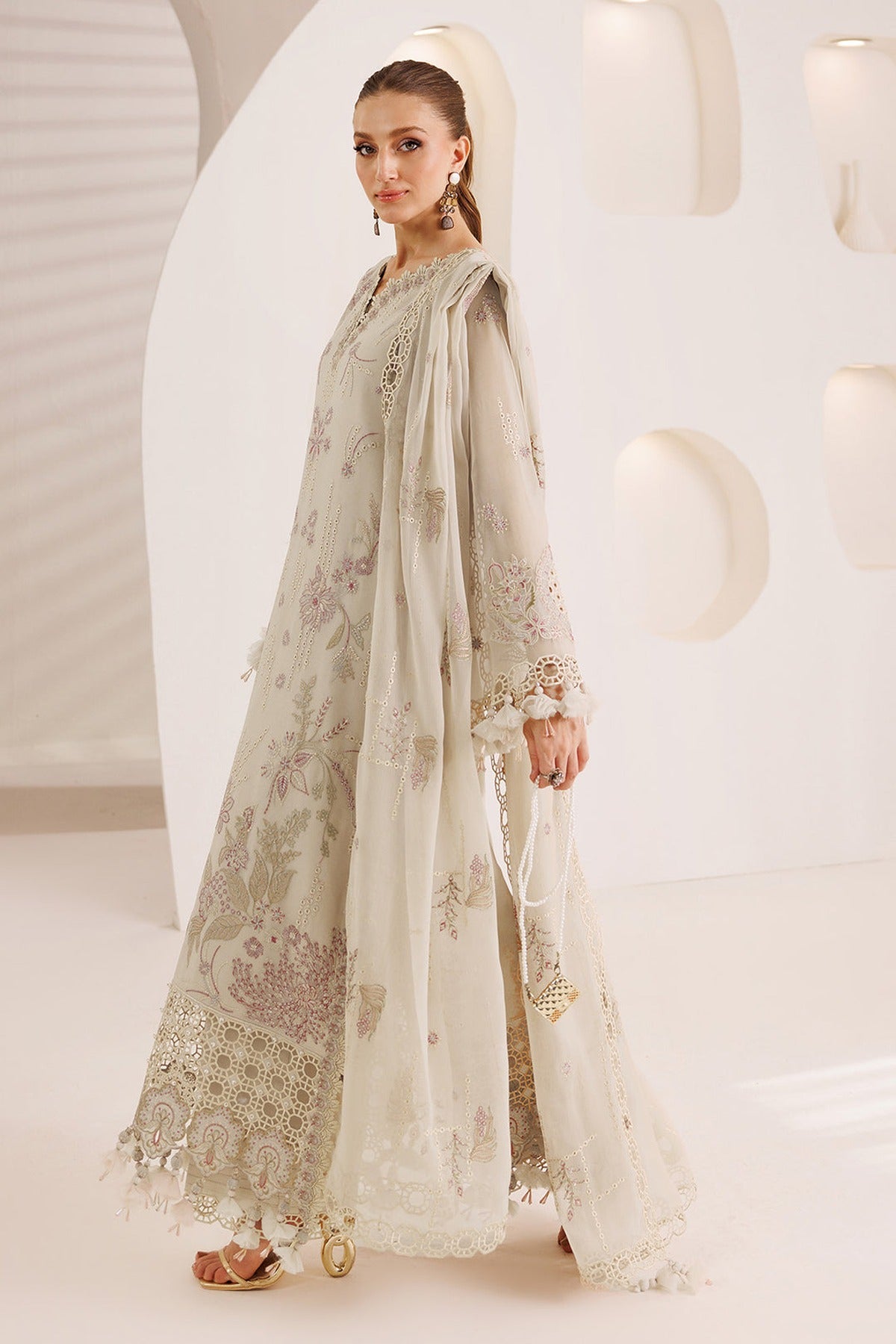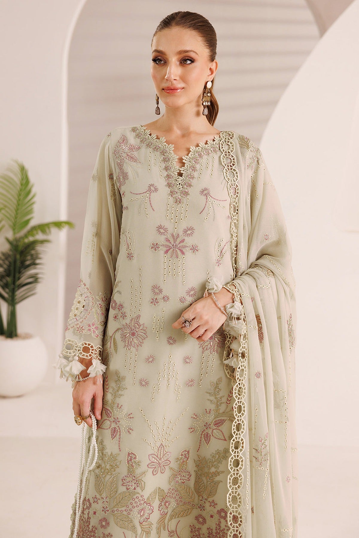 A dusty-hued ensemble with contrasting tonal floral embroidery adorns the chiffon shirt, with beautifully composed motifs brought to life through delicate foil work that adds a soft, shimmering touch. Paired with an intricately embroidered chiffon dupatta and classic raw silk trousers, this look is a graceful blend of texture and tradition.