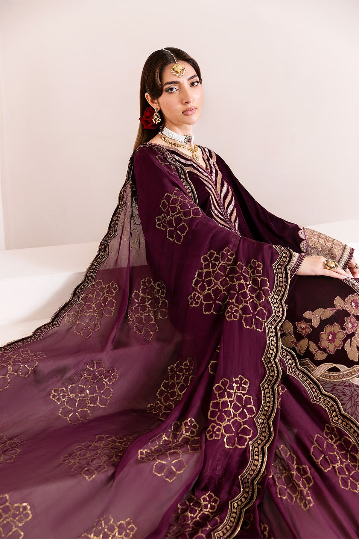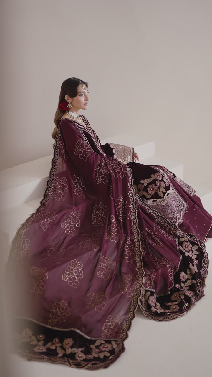 The outfit features a regal traditional silhouette with a long, flowing kameez paired with Russian trousers and a matching silk dupatta. Designed in a rich plum hue, the outfit showcases exquisite zari embroidery on the front, complemented by organza sleeve patches and an intricately detailed organza back border. The luxurious fabric and meticulous craftsmanship are enhanced by the gold and bronze embellishments