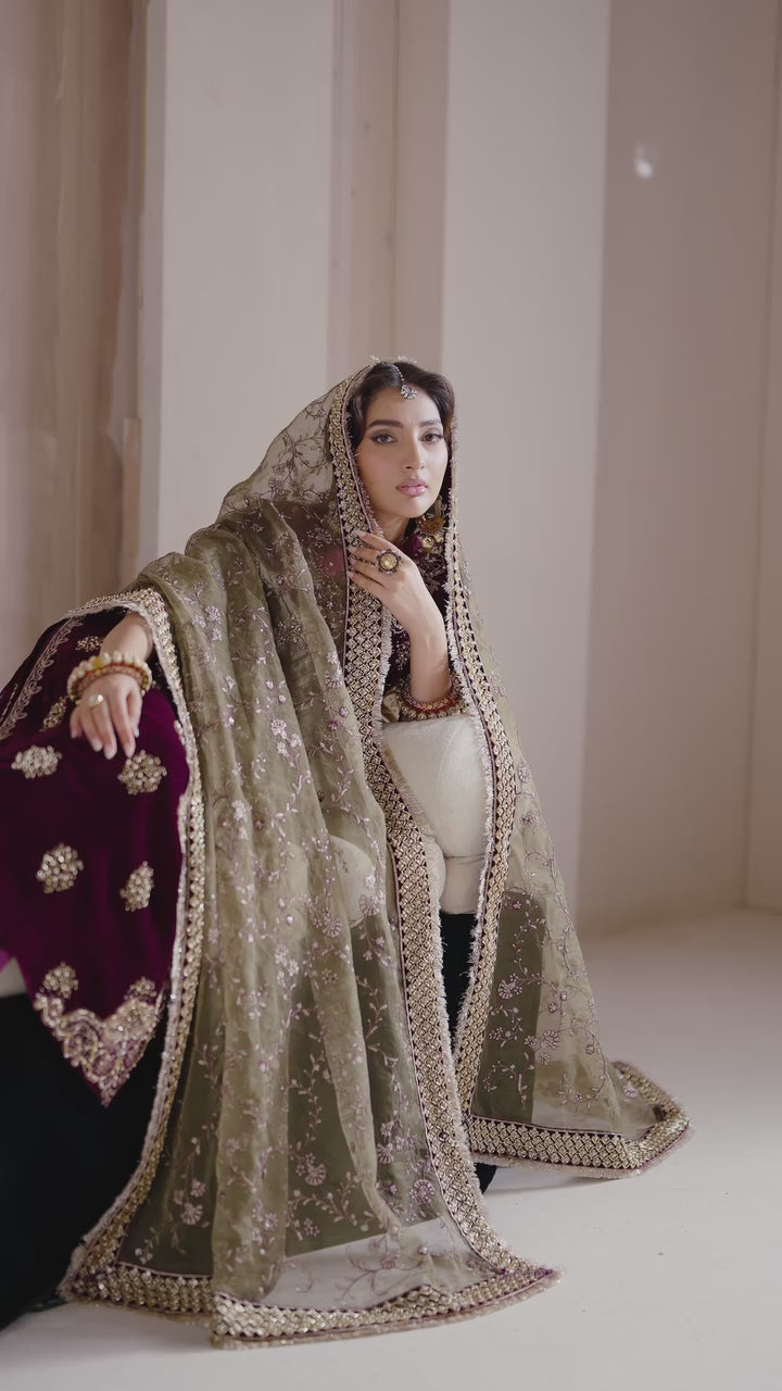 Draped in a deep mulberry amaranth hue, this straight-cut silhouette, crafted from luxurious velvet, it features a handmade front neckline rendered on organza, intricately adorned with antique gold embroidery and bead embellishments. Paired with a dyed Russian grip trouser, detailed with an embroidered hem and a contrasting olive-gold tulle organza dupatta enriched with sequins and threadwork