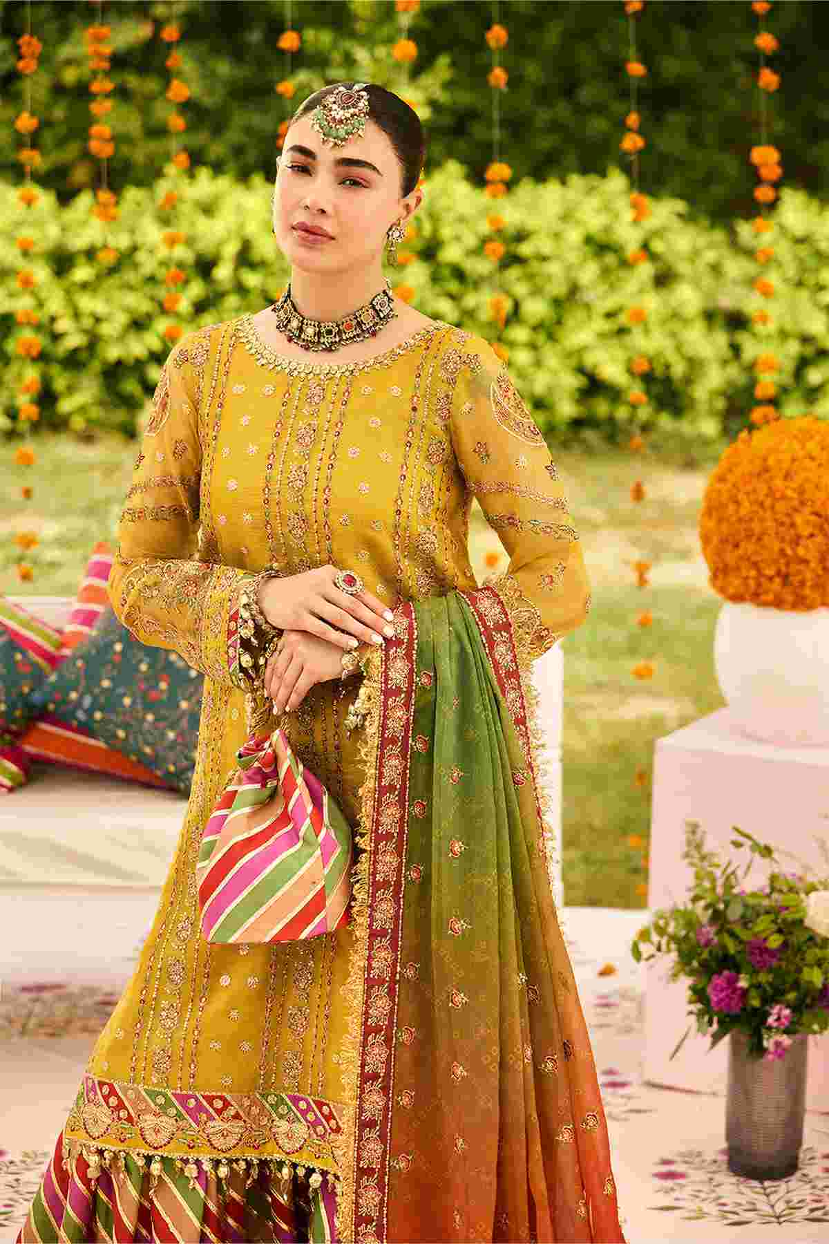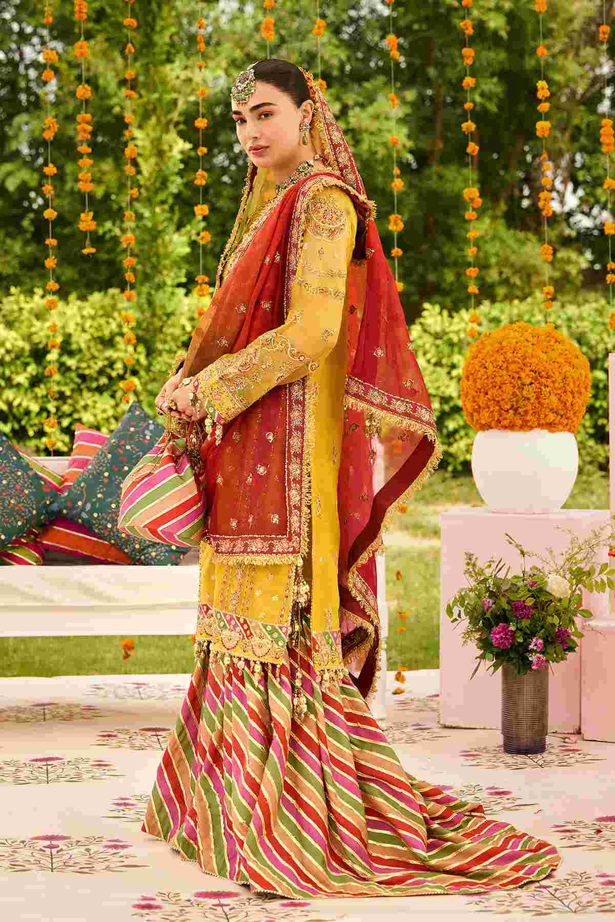 A radiant mustard and multicolored peshwas silhouette crafted from embroidered zari net front and sleeves with a matching zari net back patch, paired with printed raw silk trousers and a printed chiffon dupatta. The ensemble beautifully fuses rich embroidery with vibrant prints, making it a perfect choice for festive celebrations.