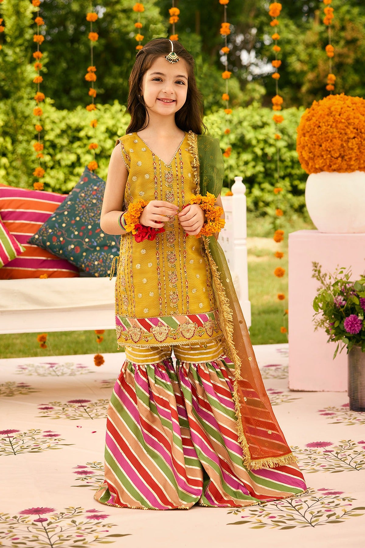 A bright ensemble perfect for festive fun. The sleeveless V-neck shirt is made of Zari net and features detailed embroidery on both the front and back. A rich, embroidered trim is added to the hemline for a neat finish. The bottom is a bold printed trouser crafted from raw silk, which gives it a crisp shape. A soft, printed chiffon dupatta with a lovely, flowing drape completes it.