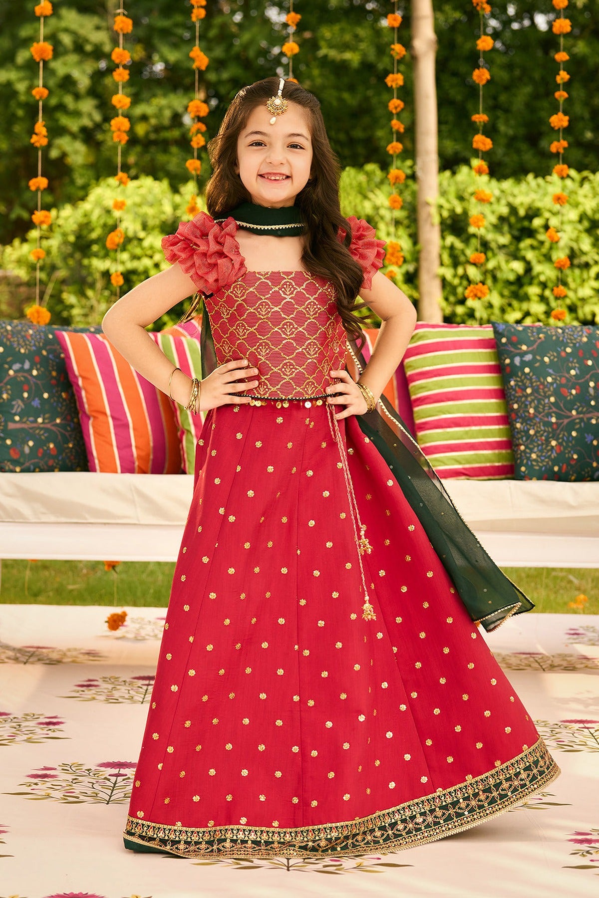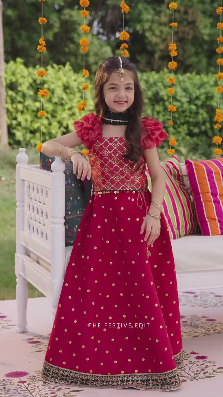 A stunning zari net choli featuring intricate embroidery paired with an embroidered raw silk lehenga and a contrast green chiffon dupatta. The rich red and gold tones blend tradition with festive charm - a perfect pick for wedding and celebration looks.