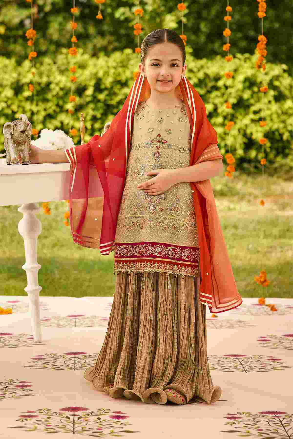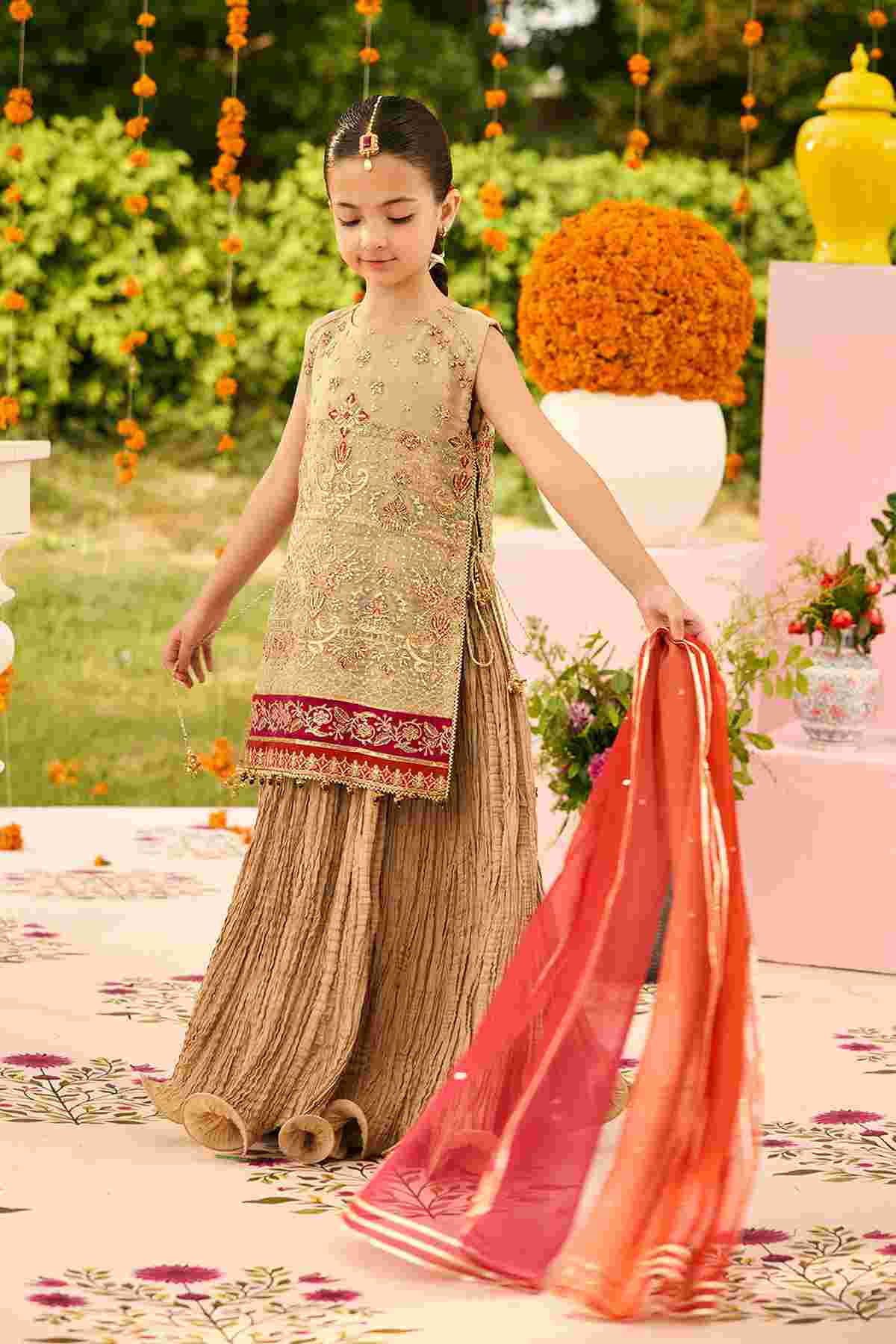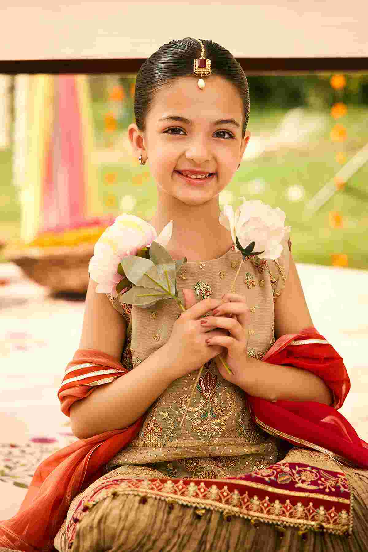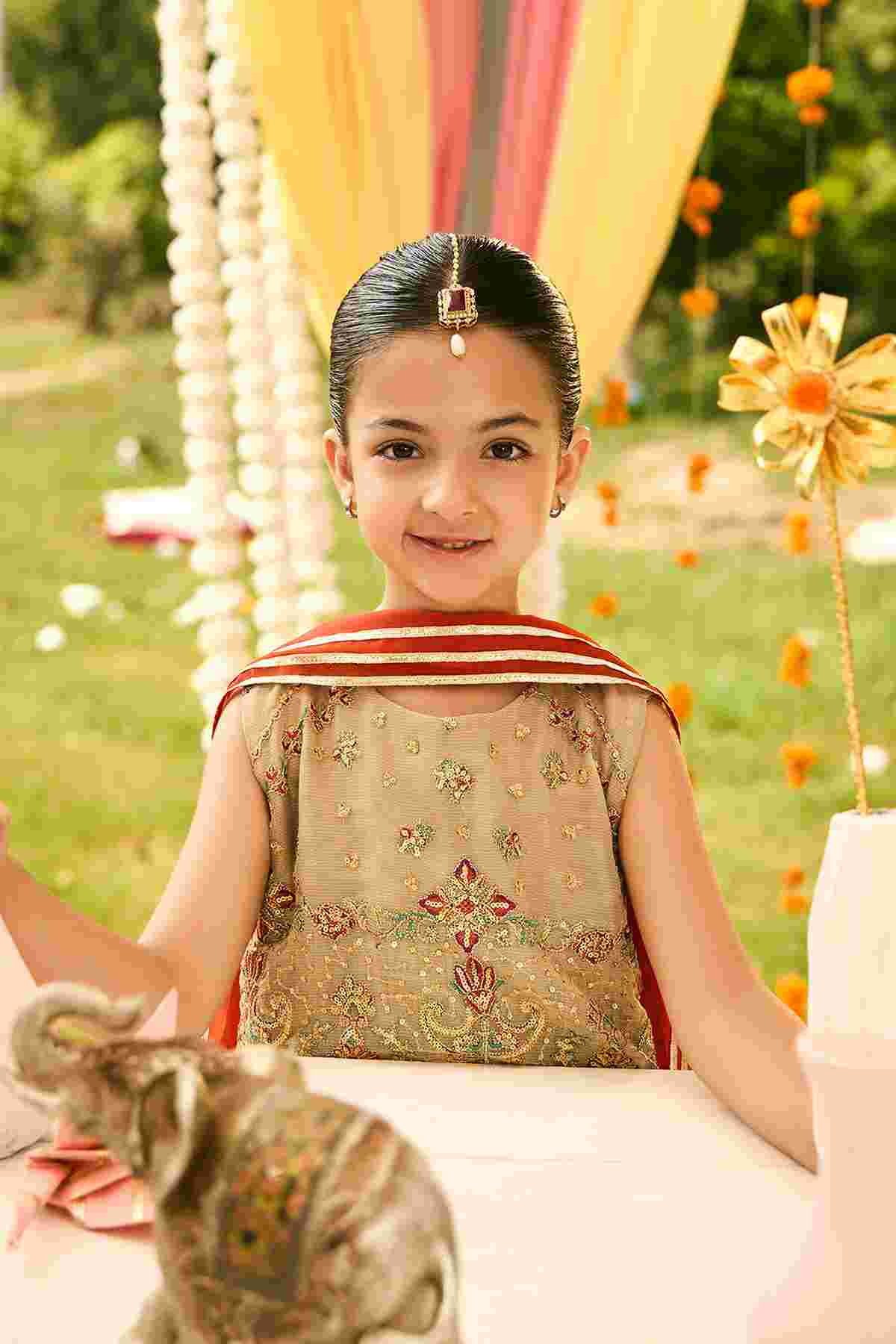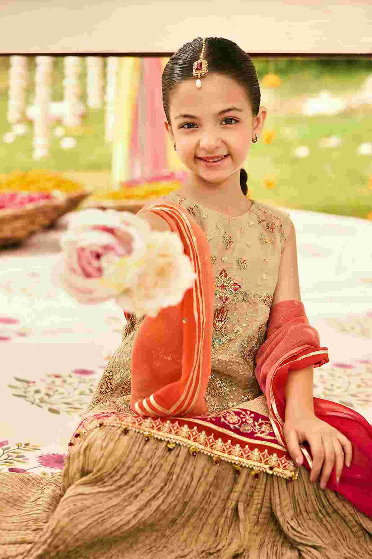 A beautiful peach shirt featuring shimmering Mukesh work on the Zari net fabric. The shirt has a detailed embroidered trim accenting the neck and sleeves. Paired with a stylish, textured Jamawar trouser for a comfortable, wide-leg look. Finished with a coordinating Bamber Chiffon dupatta.
