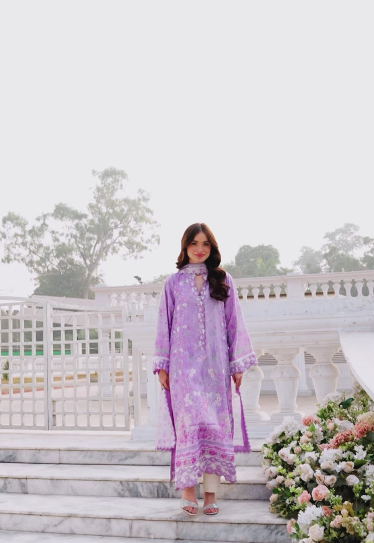 The splendor of the season comes alive in this enchanting light purple ensemble, a canvas of floral artistry reminiscent of a pastel dreamscape. The digitally printed light purple shirt features an embroidered neckline, breathing new life into the floral story, like a garden in full bloom, while the intricately embroidered sleeves and borders weave a tapestry of elegance. Paired with a digitally printed silk dupatta that flows like a whisper of sophistication, this outfit stands as a flawless choice for both formal and casual occasions, exuding timeless charm.