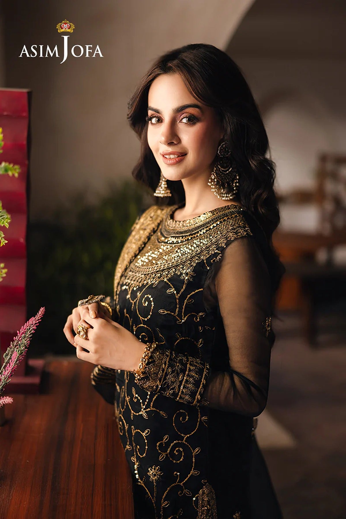 Unleash the allure of black with this dramatic masterpiece. Antique gold zari embroidery cascades across the fabric, exuding an aura of vintage charm. Light gold sequins add a touch of glamour, dancing under the light like stars in a midnight sky. The accompanying organza dupatta elevates this design, making it the epitome of modern sophistication.