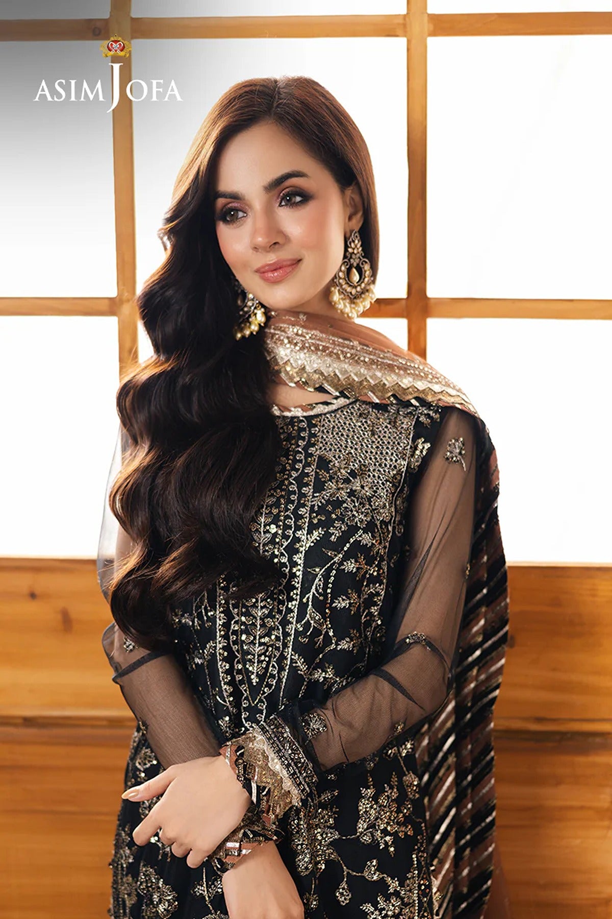 A symphony of contrasts, this black ensemble is adorned with intricate black and taupe threadwork, creating a refined interplay of textures. Light gold zari and two-toned mink zari flow harmoniously, crafting a masterpiece of rich detailing. Scattered with luminous light gold sequins, this ensemble is paired with an embroidered dupatta, embodying bold elegance with a touch of artistry.