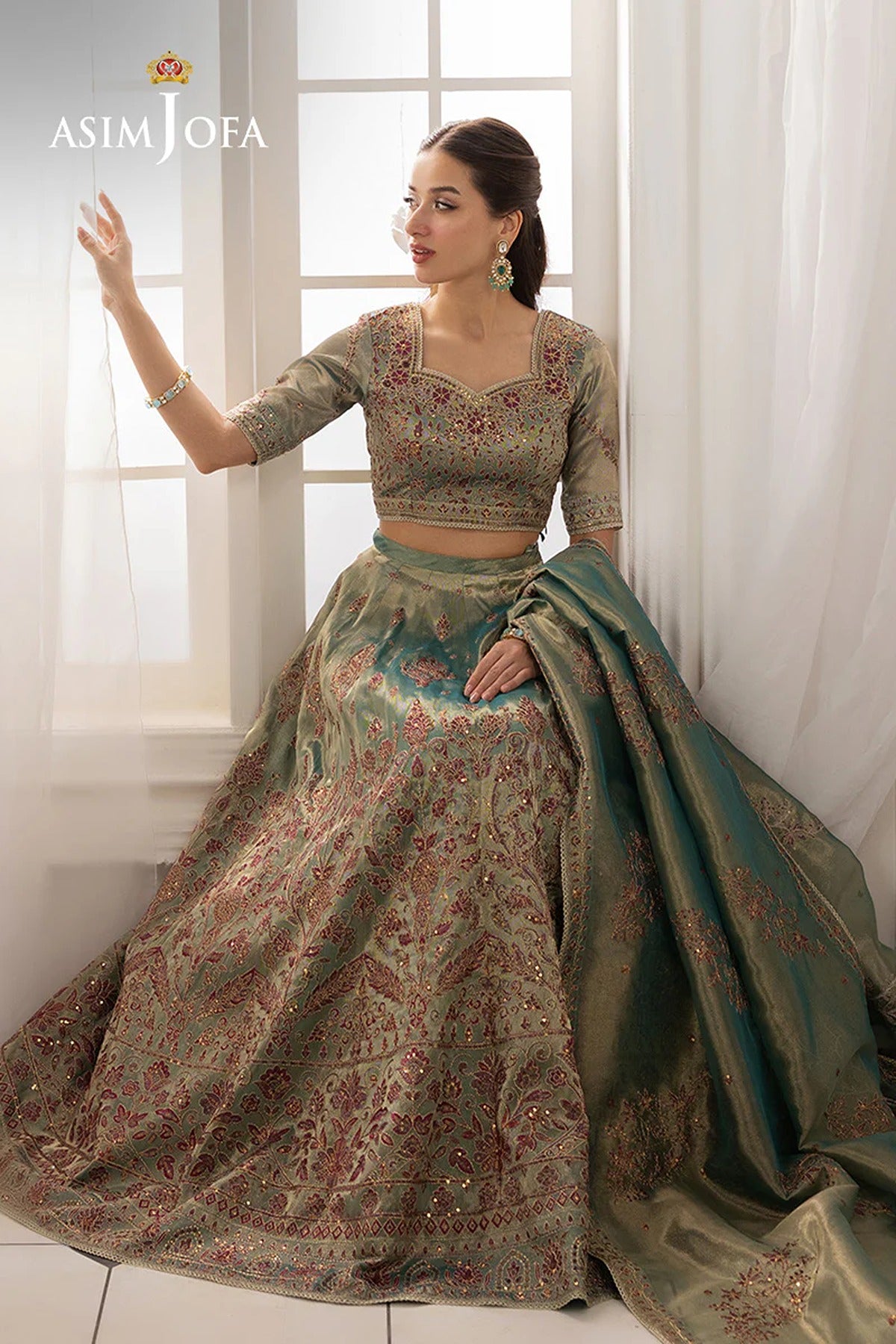 A twirl beneath turquoise skies, this aqua-hued lehenga choli is spun from the light of dreams and the depth of desire. Gilded with gold zari and antique sequins that glisten like sunlit waves, the ensemble dances with threadwork in coffee and maroon, earth and fire whispering secrets across the intricately embroidered kalis. The lehenga sways with the elegance of a lullaby in motion, while the embroidered dupatta, adorned with bold motifs, drapes like a royal breeze. A vision meant for the spotlight, this look is for the one who twirls not just in fabric, but in the magic of the moment.