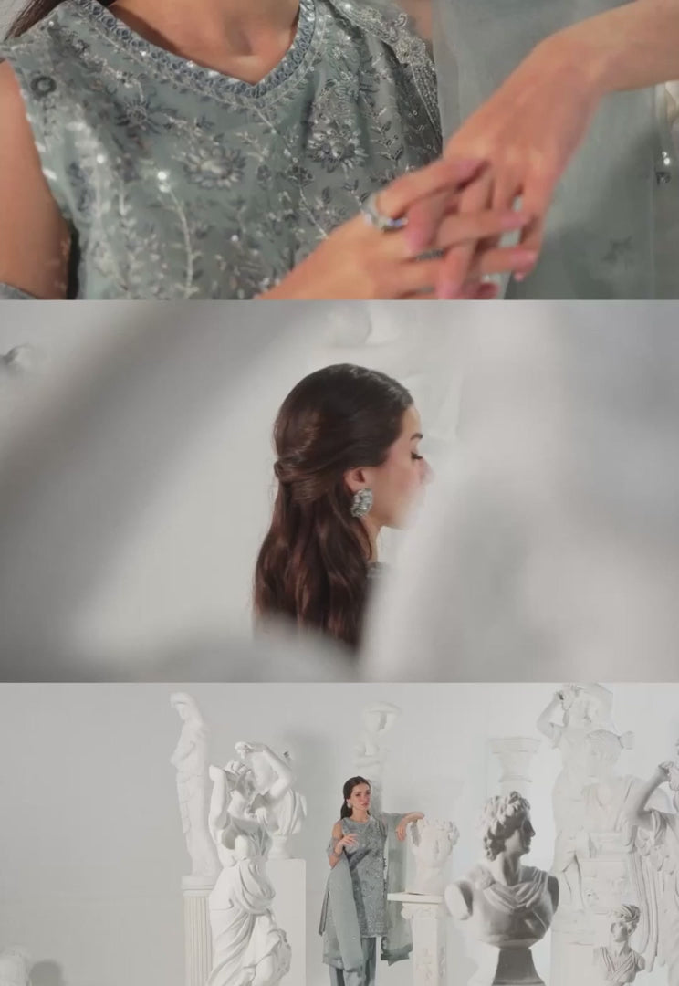 Where modernity brushes against classic form, this grey ensemble emerges like morning mist over timeless stone. The shirt gleams with silver zari and sequins, capturing light like frost on glass, while ice blue and deep grey threadwork intertwine across the front, subtle yet striking, like a whispered symphony. Paired with a regal farshi shalwar, its hem dusted in sequins that shimmer with every step, the look finds its finishing note in a feather-light, scalloped dupatta embroidered with delicate precision. This is the quiet power of grace—cool, composed, and endlessly captivating.