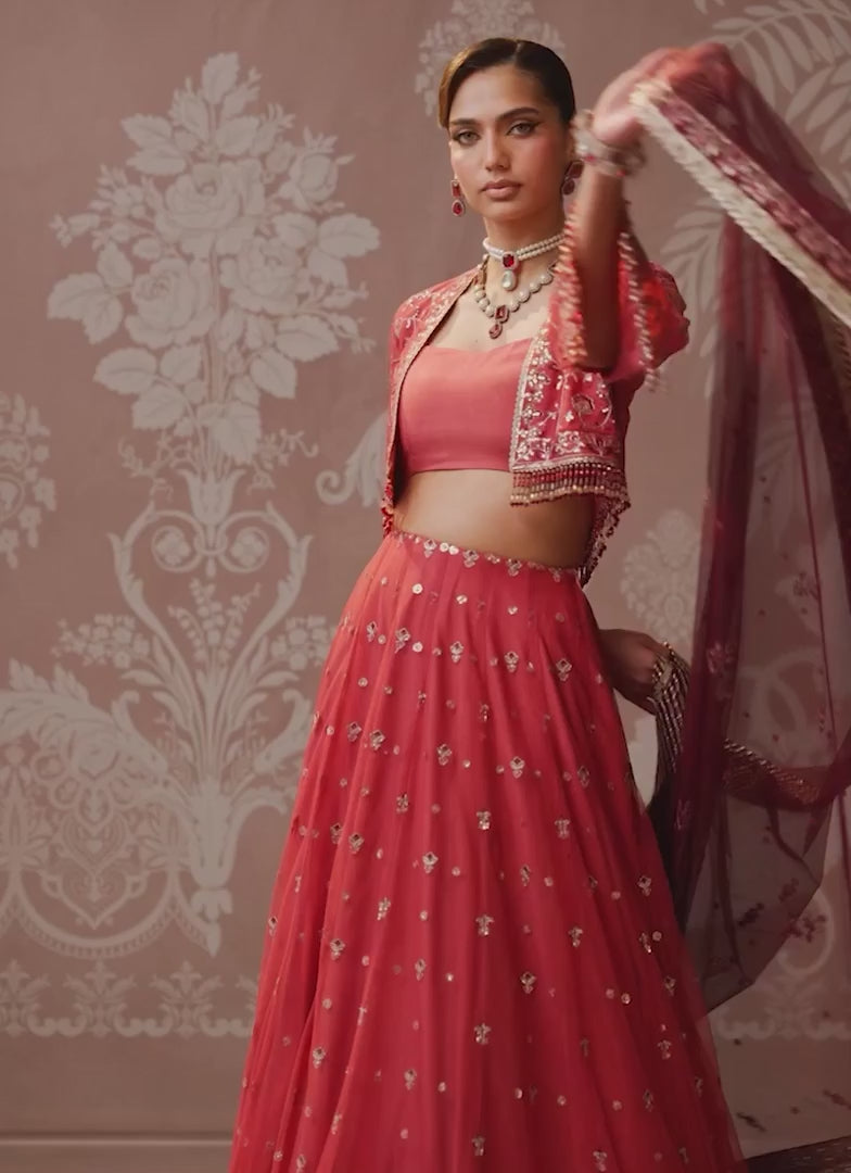 Designed for those who enjoy styling freedom during festive occasions, this coral pink ensemble blends tradition with versatility. Light gold zari and sequins shimmer across the surface, complemented by maroon and coral threadwork that enhances the warmth of the color. Whether worn as a lehenga or styled as a peshwas, the ensemble adapts effortlessly to your personal expression. Paired with a beautifully embroidered dupatta in a contrasting maroon shade, it is a piece that celebrates individuality while remaining rooted in festive elegance.