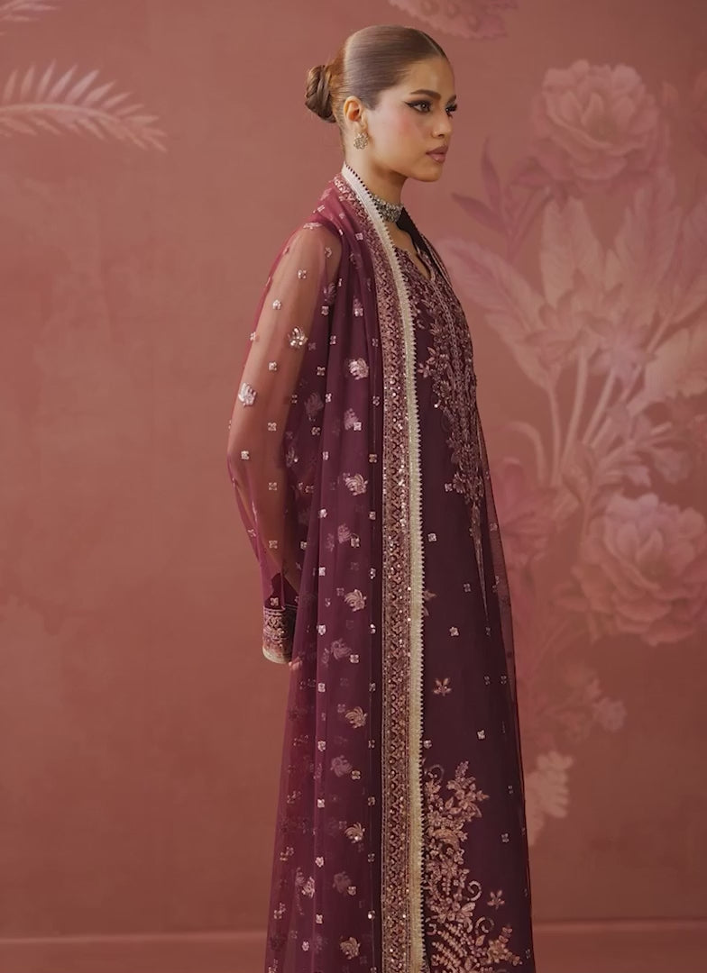 Deep tones reminiscent of an amethyst stone reflect gracefully in this plum ensemble, designed for layered festive looks. The front-open shirt is embroidered with light copper zari and sequins, accented by deep purplish pink and plum threadwork that enhances its richness. It can be worn as a long shirt or styled in a jacket-inspired manner, offering versatility without compromising elegance. Paired with embroidered trousers and a beautifully embroidered dupatta, the ensemble feels both graceful and distinctive.