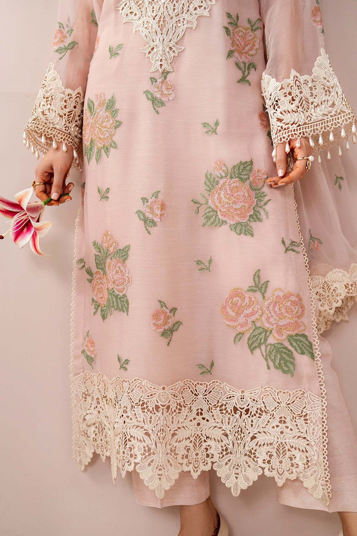 - Trousers/Bottoms styled as per image with embellishments if shown in the image.