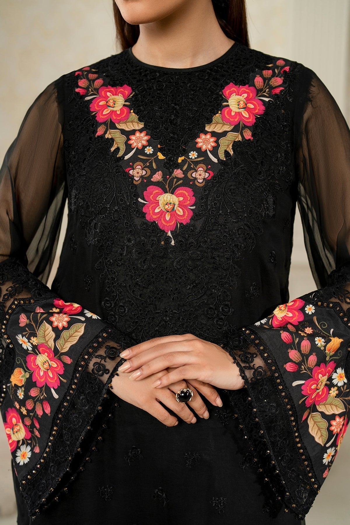 Shirt fabric : embroidered chiffon with printed silk neckline and sleeve border