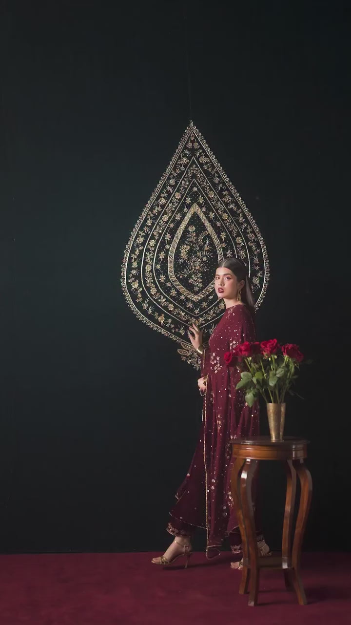 - This elegant three piece ensemble showcases a straight long maroon shirt featuring an intricately embroidered neckline on the front, beautifully finished with kavya detailing. The back neckline includes a keyhole design with delicate dori tassels, adding a refined and feminine charm. The high-waisted chaak and embroidered side borders frame the silhouette gracefully, while the sequin spread on the front adds a soft, festive shimmer. The fitted sleeves complete the look with understated sophistication.