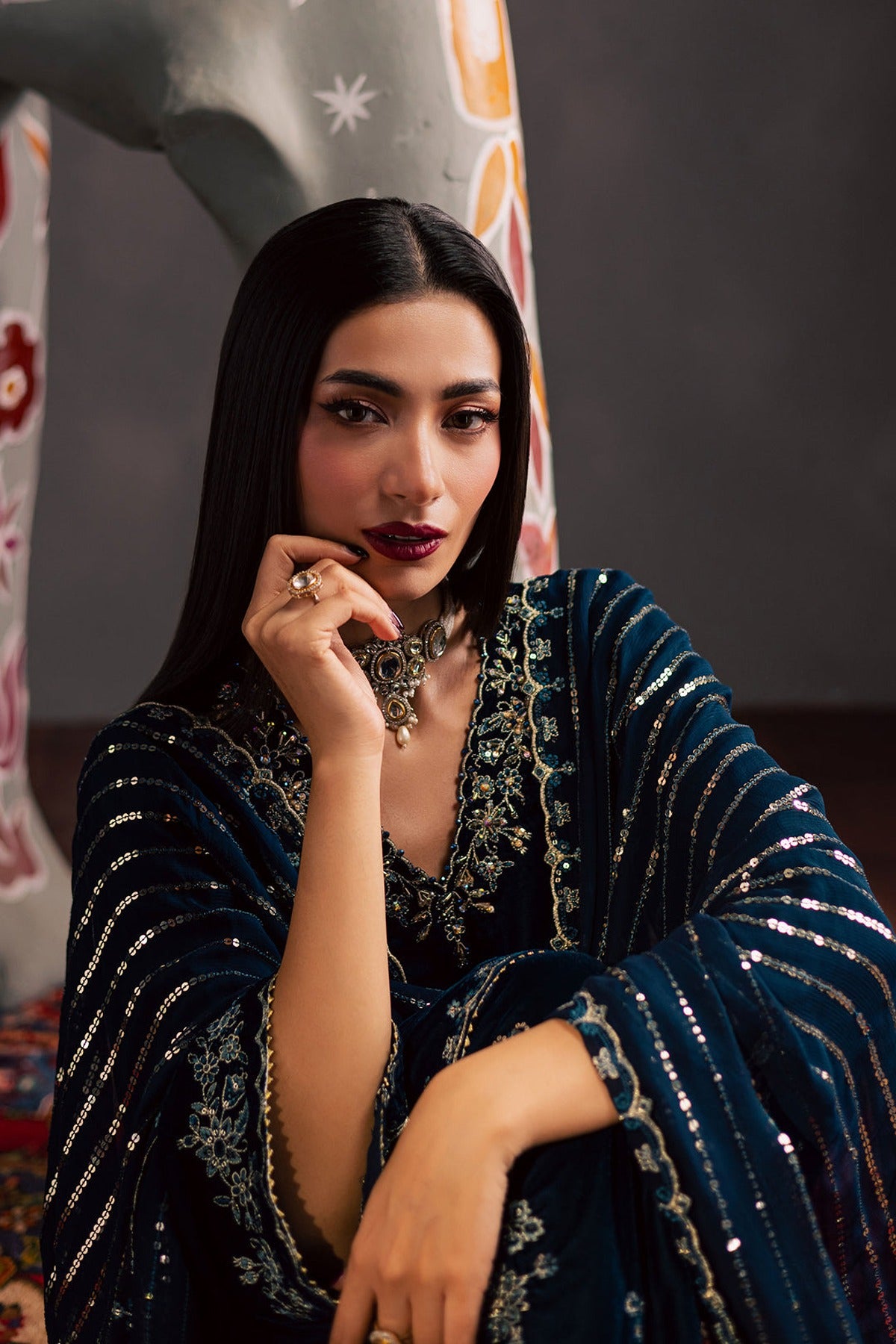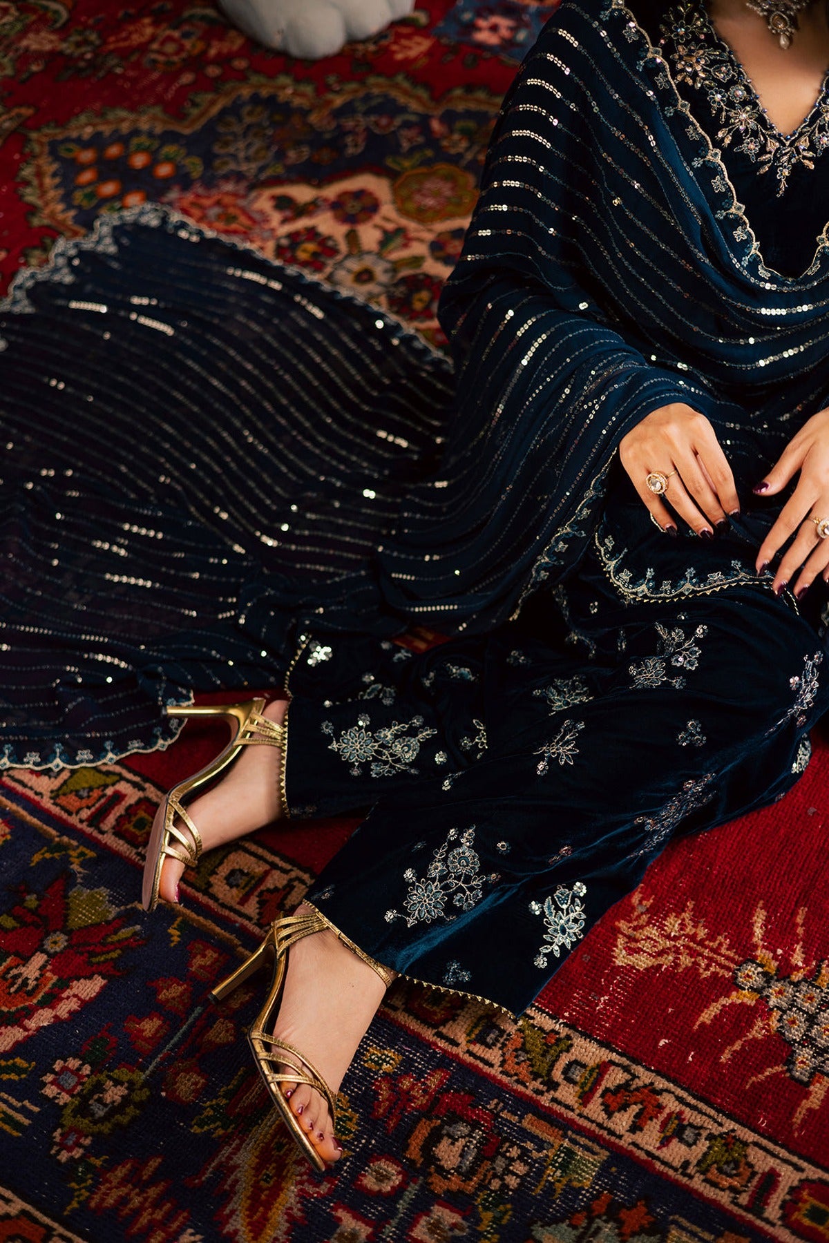 - The look is completed with a crinkle dupatta heavily embroidered throughout and finished with silver samosa lace along the edges. Its luminous detailing and airy texture provide the perfect contrast to the plush velvet base, making this ensemble a radiant statement for formal winter occasions.