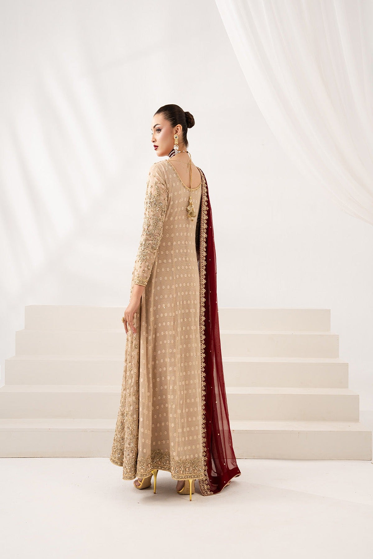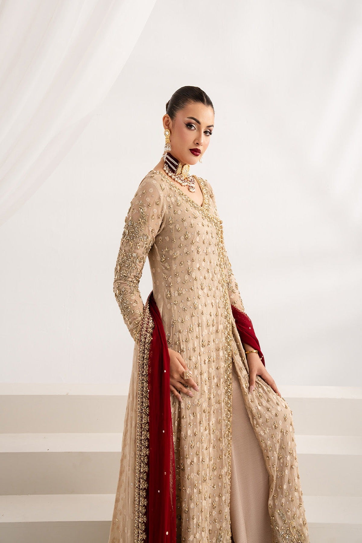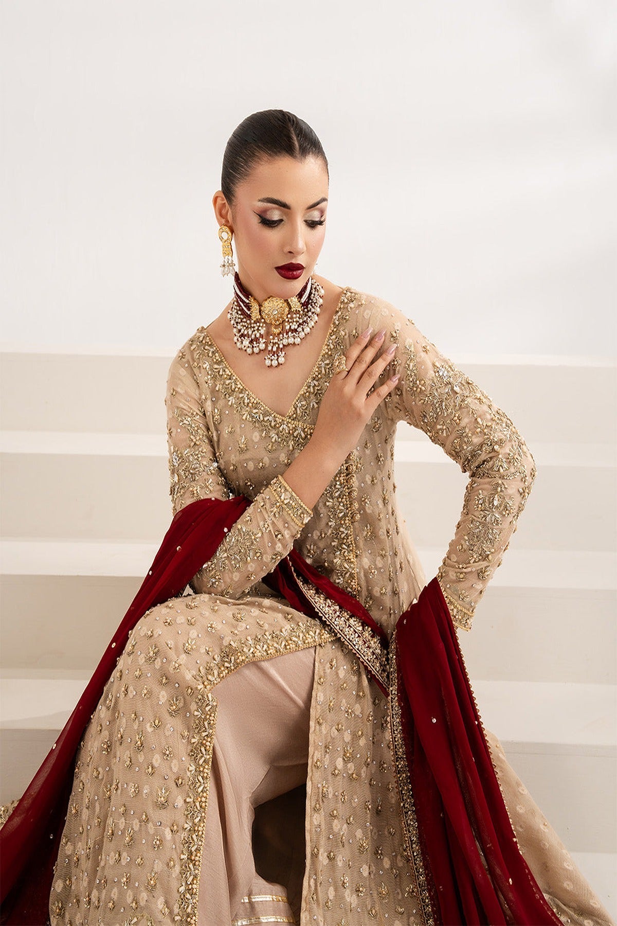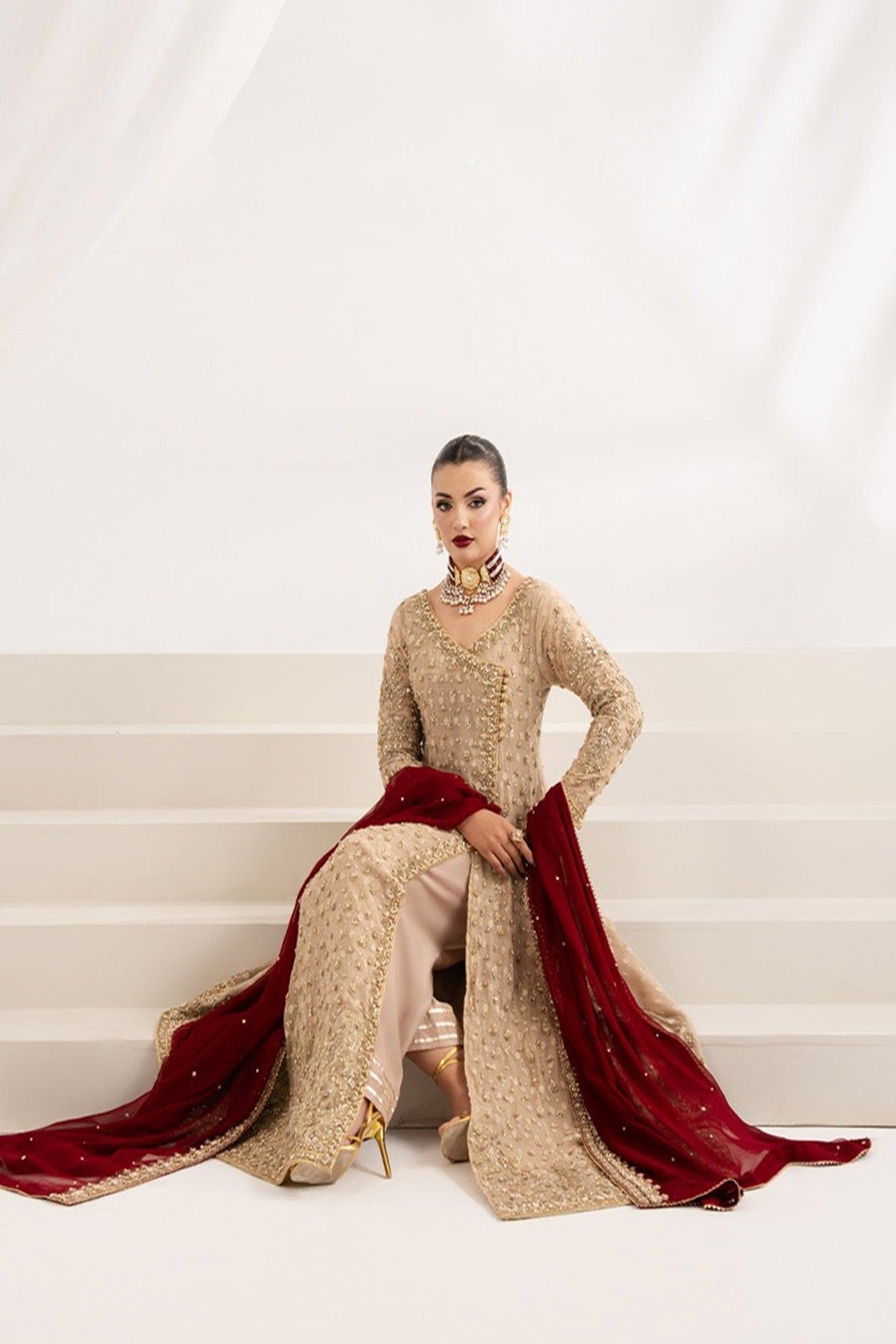 Up your ethnic glam in every stitch of heritage with our beautiful angarkha paired up with majestic maroon dupatta that has one sided border work. Paired up with gotta finishing palazzo pants.