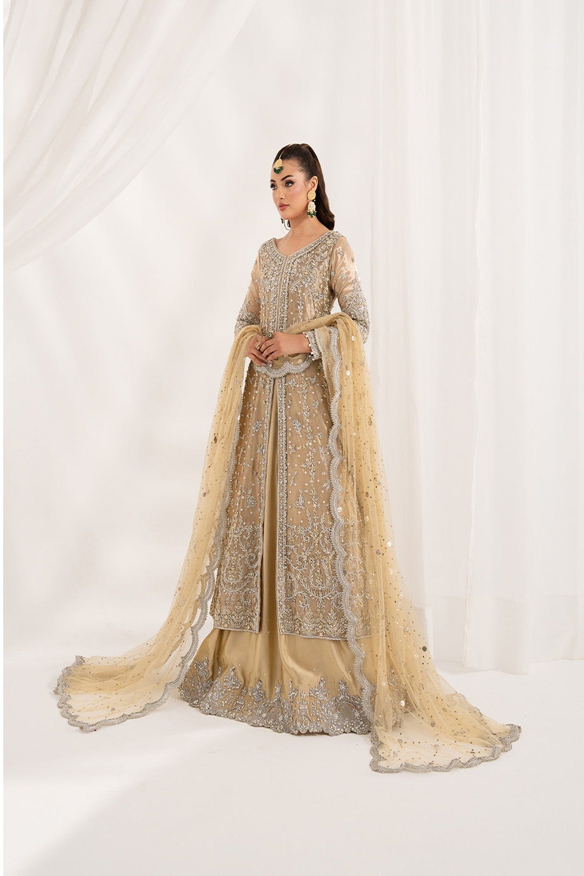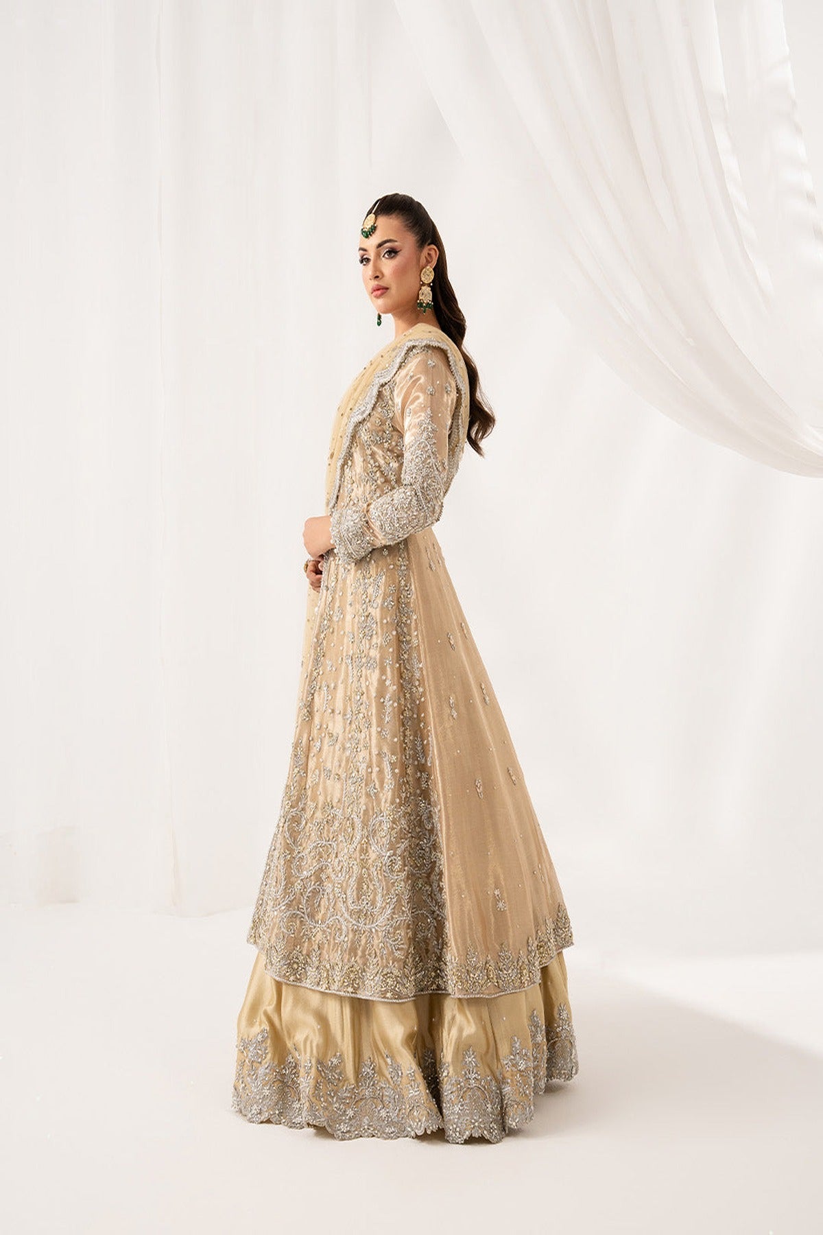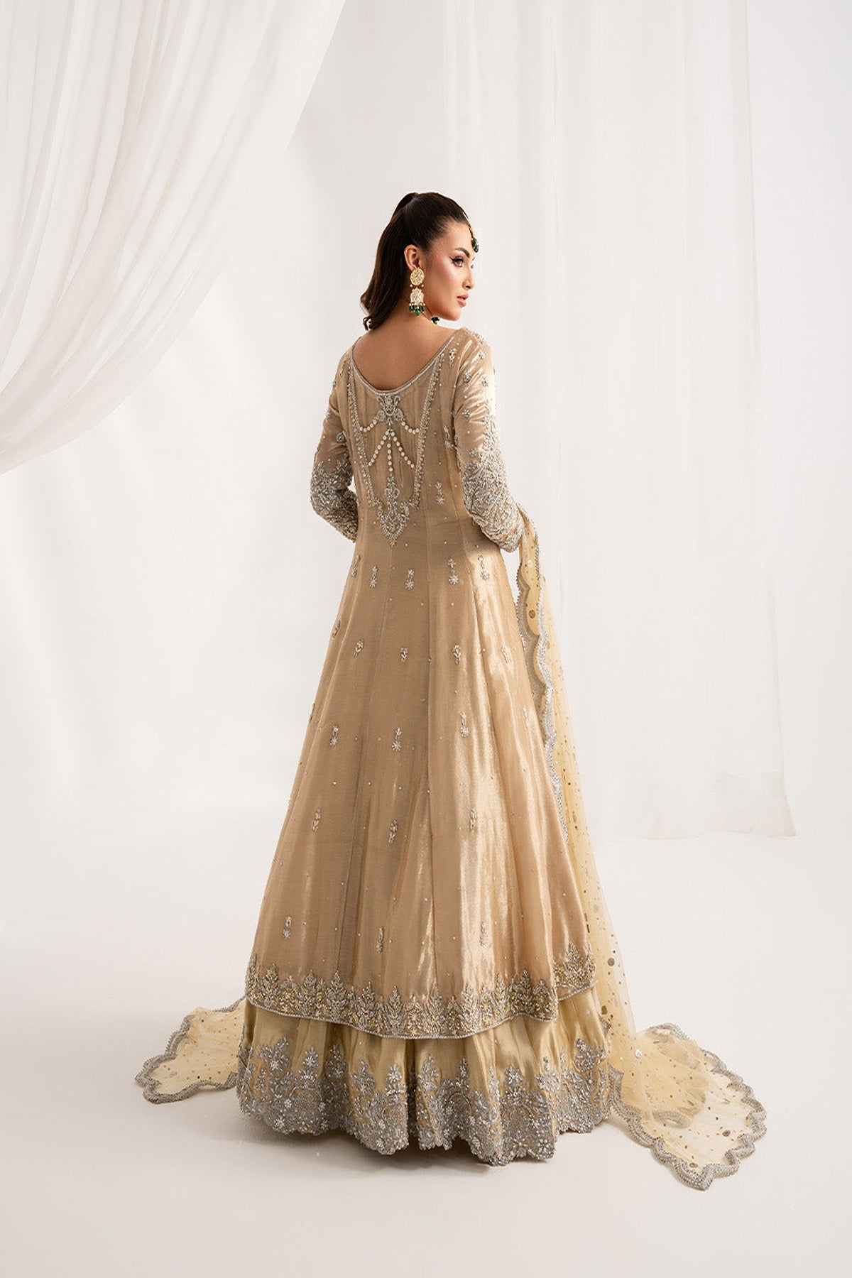 Heritage refined into silhouettes of quiet grandeur and exquisite handcraftmanship. This lama tissue silk gown is such an elegant embellished attire, radiating elegance and charm for the perfect wedding look. Paired up with tussel silk lehnga and net muqaish dupatta to complete the look
