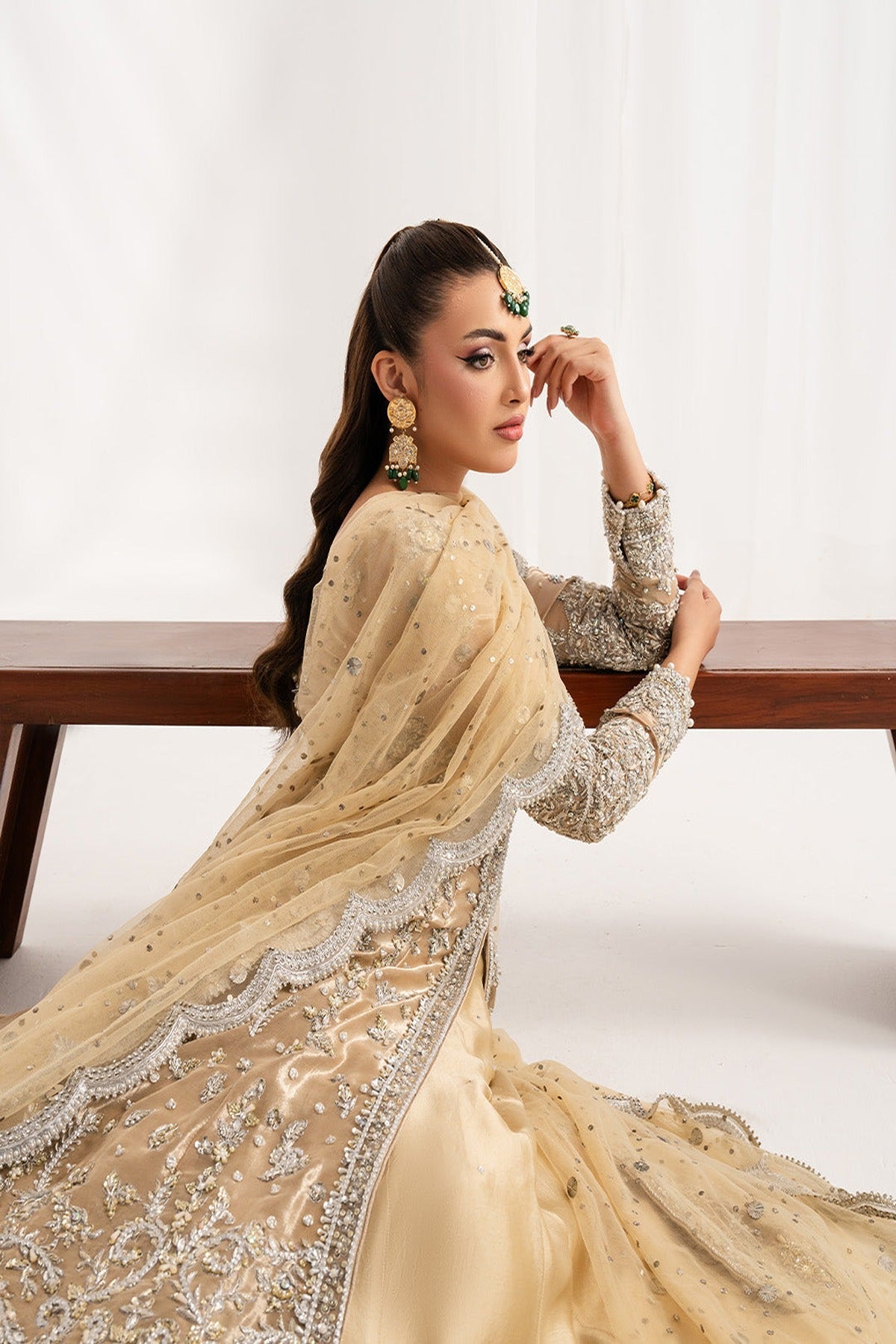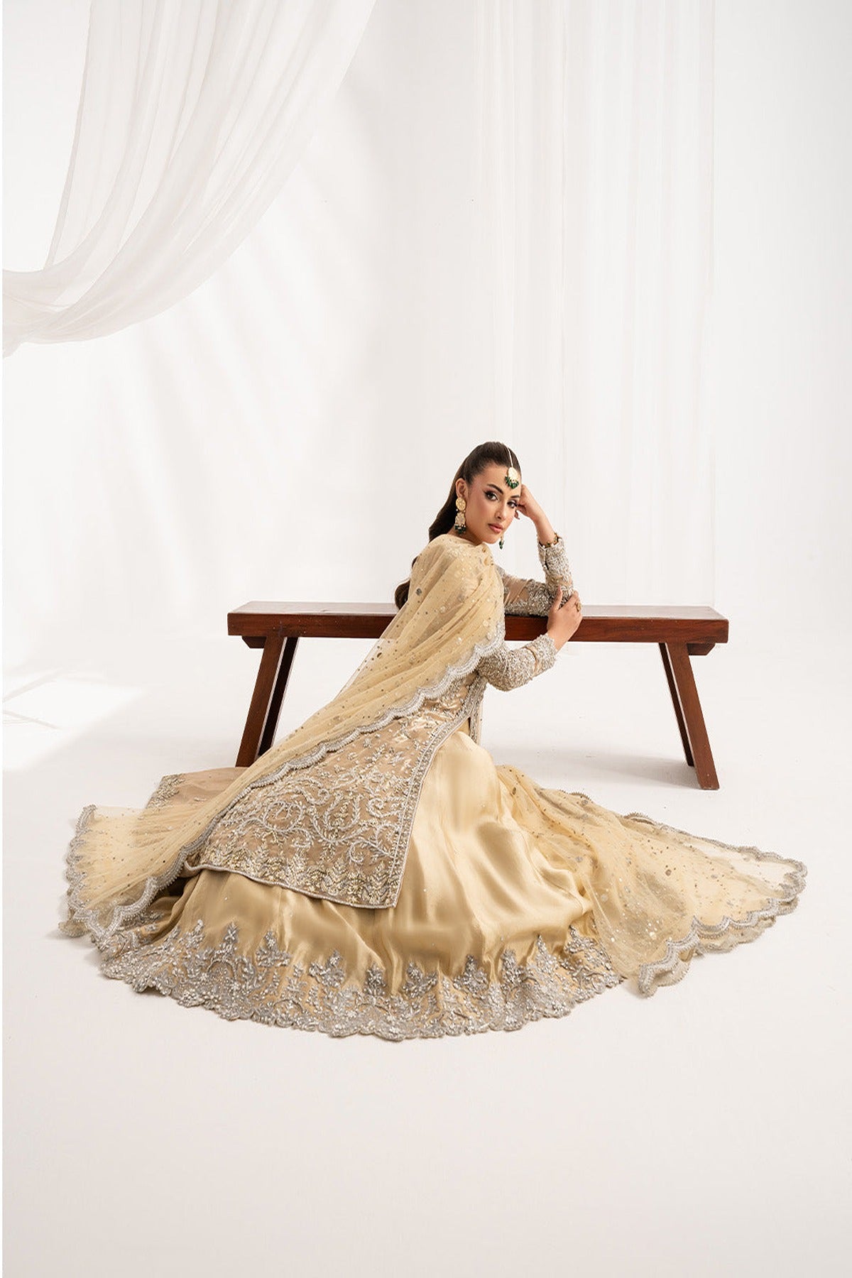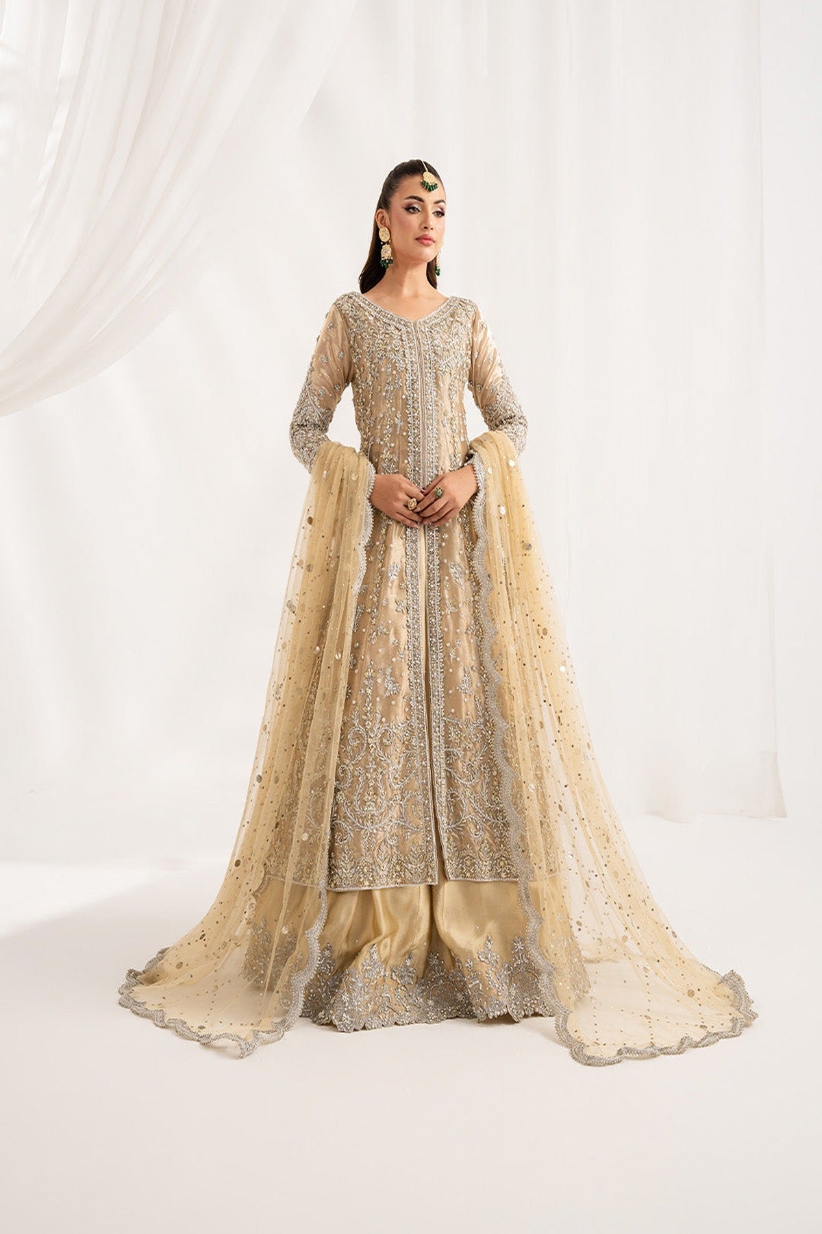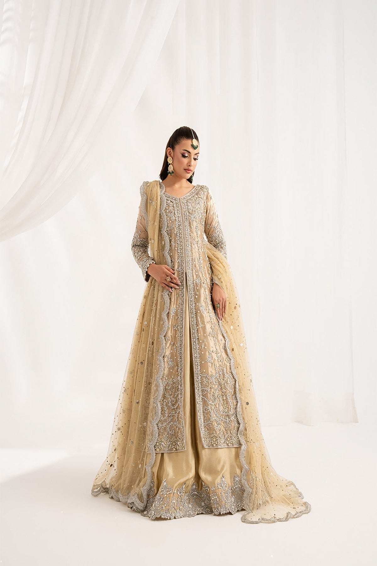 Heritage refined into silhouettes of quiet grandeur and exquisite handcraftmanship. This lama tissue silk gown is such an elegant embellished attire, radiating elegance and charm for the perfect wedding look. Paired up with tussel silk lehnga and net muqaish dupatta to complete the look