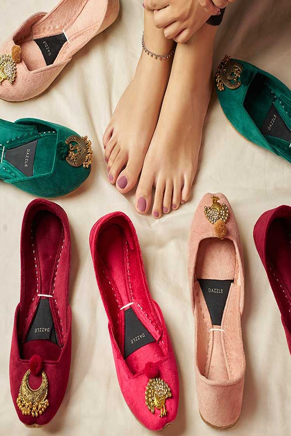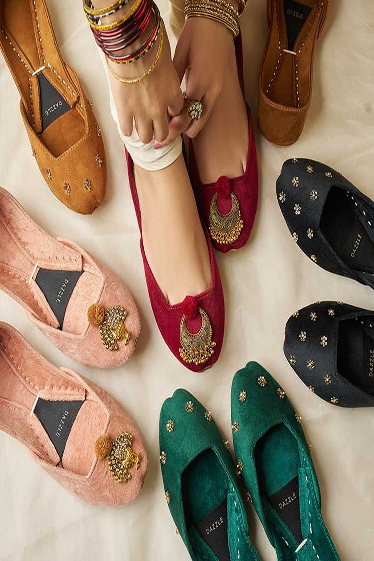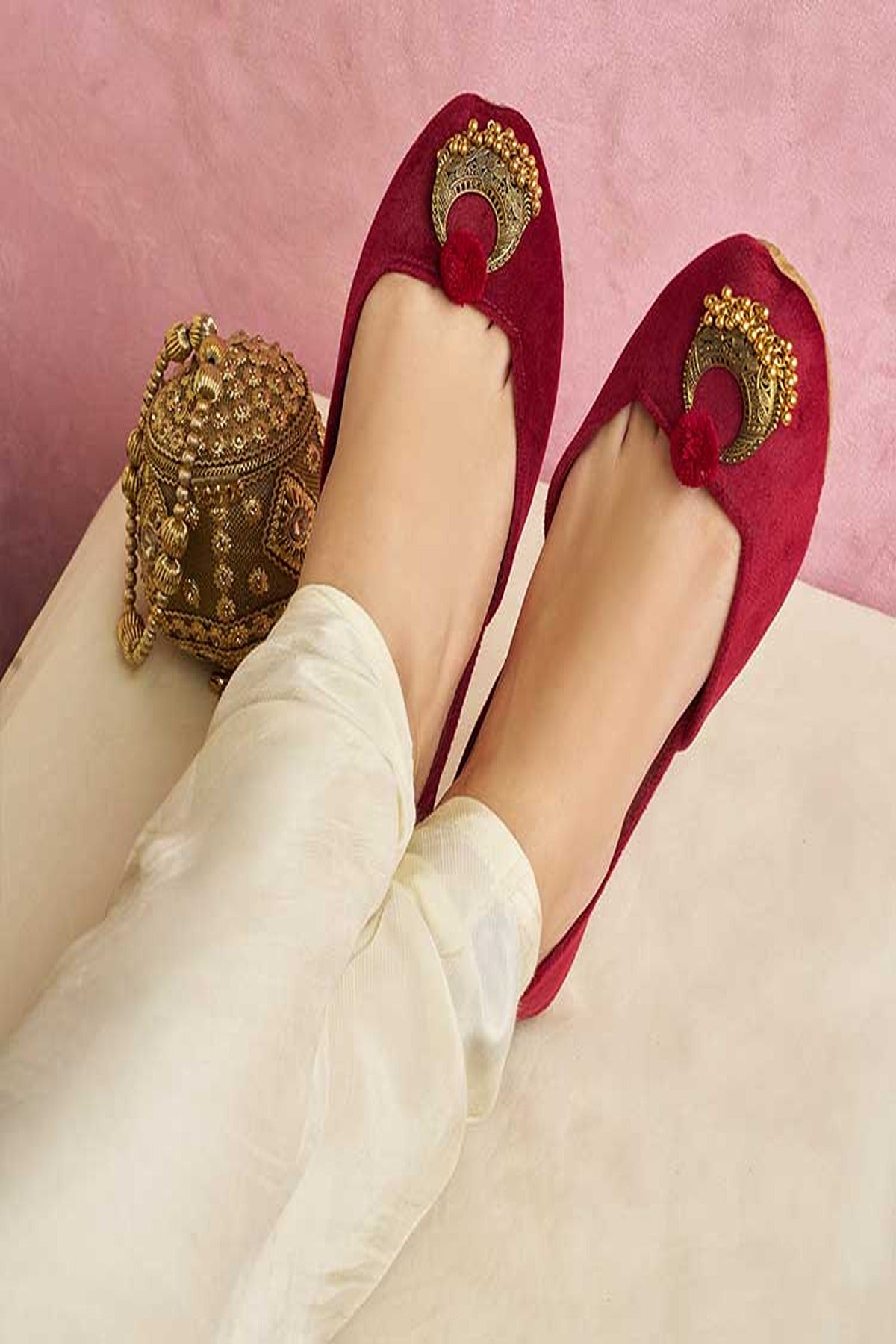 Janiya decorated with a traditional jewelry design, that gives an aura of elegance to your outfit. This Khussa, which is made from high-quality velvet, has a deep maroon color that is ideal for formal events and celebrations. Unmatched comfort is offered by the double-padded sole, which makes it perfect for long-term use.