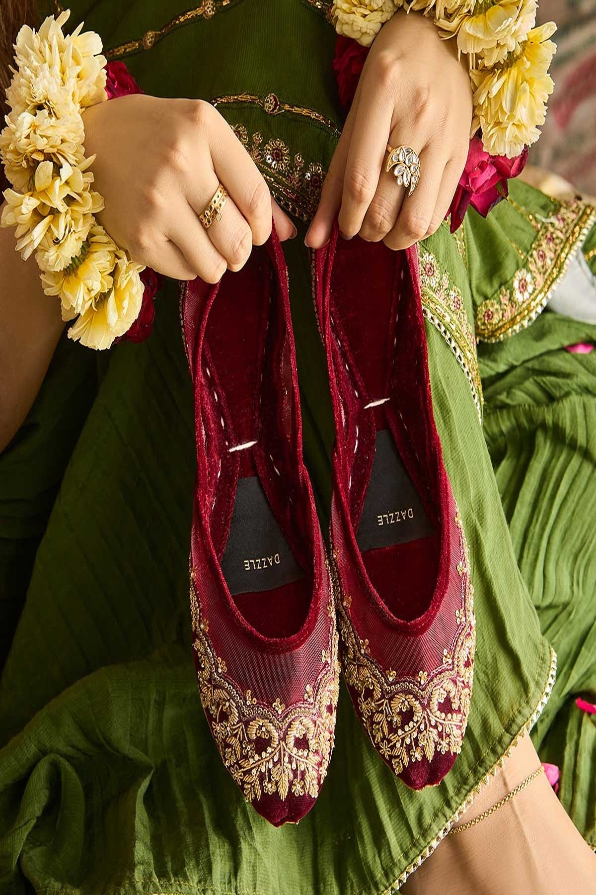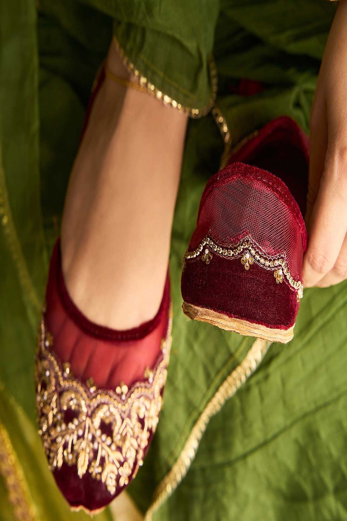 Marina is handcrafted on the finest maroon net base and adorned with tilla work and florals in repose. It is the perfect classical statement handmade to the finest detail with comfortable velvet double padded soles for your wardrobe this festive season.