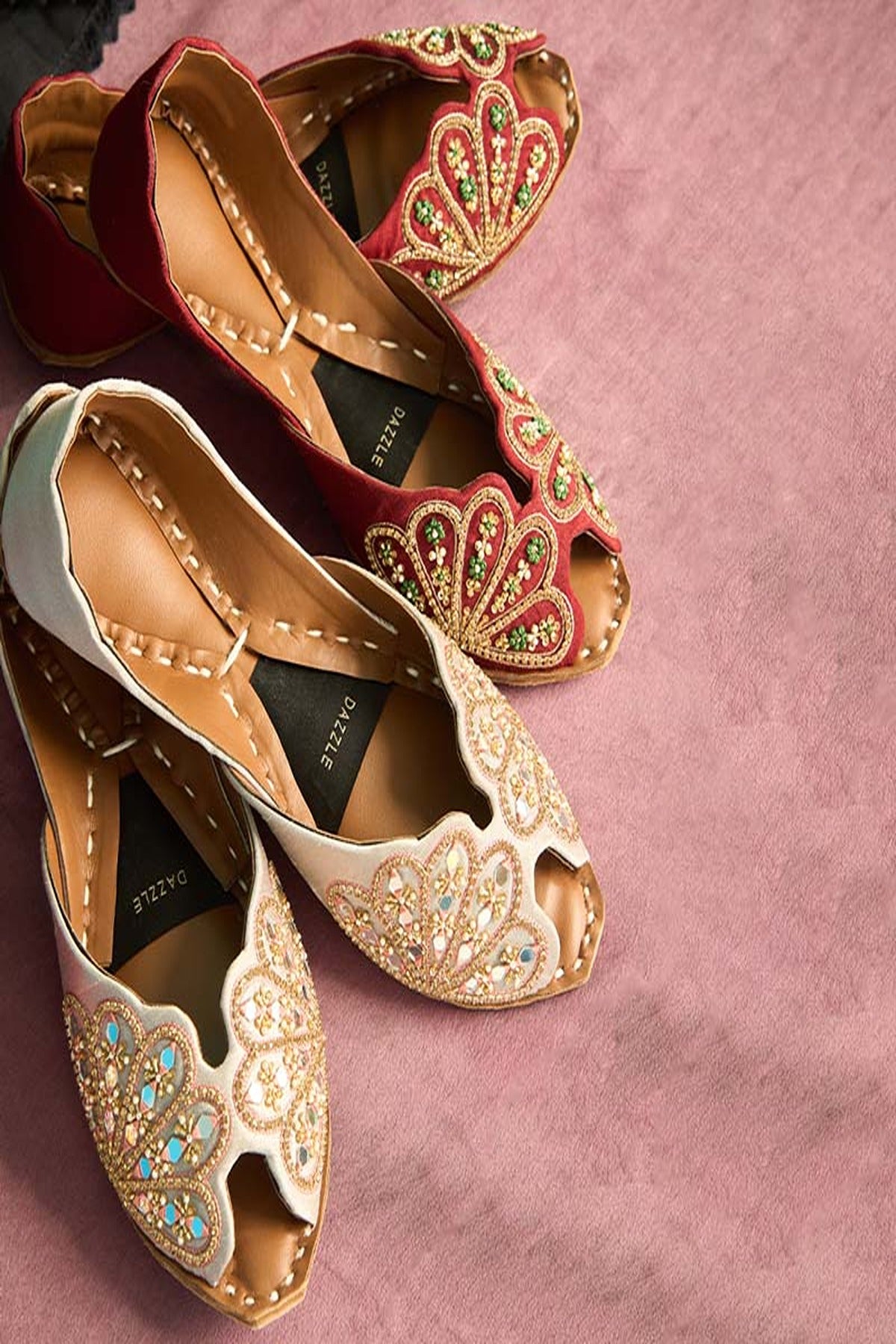 A distinct design is showcased in a steel grey khussa crafted from raw silk, featuring Resham and mirror embellishments on both sides. The fabric used is raw silk adorned with decorative elements.
