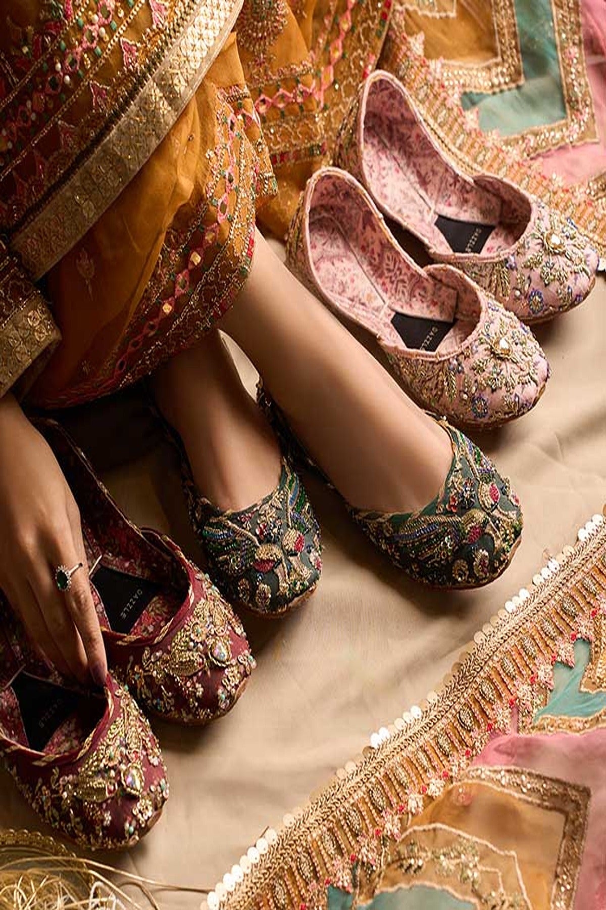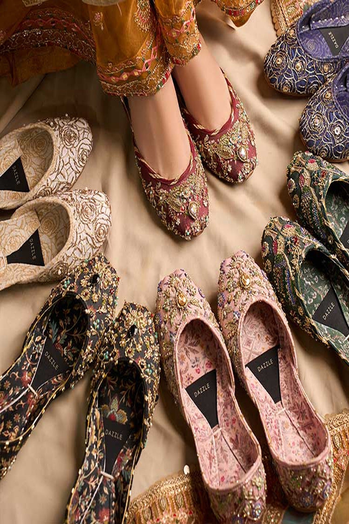 Shagna, which have a deep navy blue base with elaborate gold flower embroidery, pay homage to classic craftsmanship. They are the ideal partner for festive and wedding attire because of their plush fabric and plush insole, which provide unmatched comfort.
