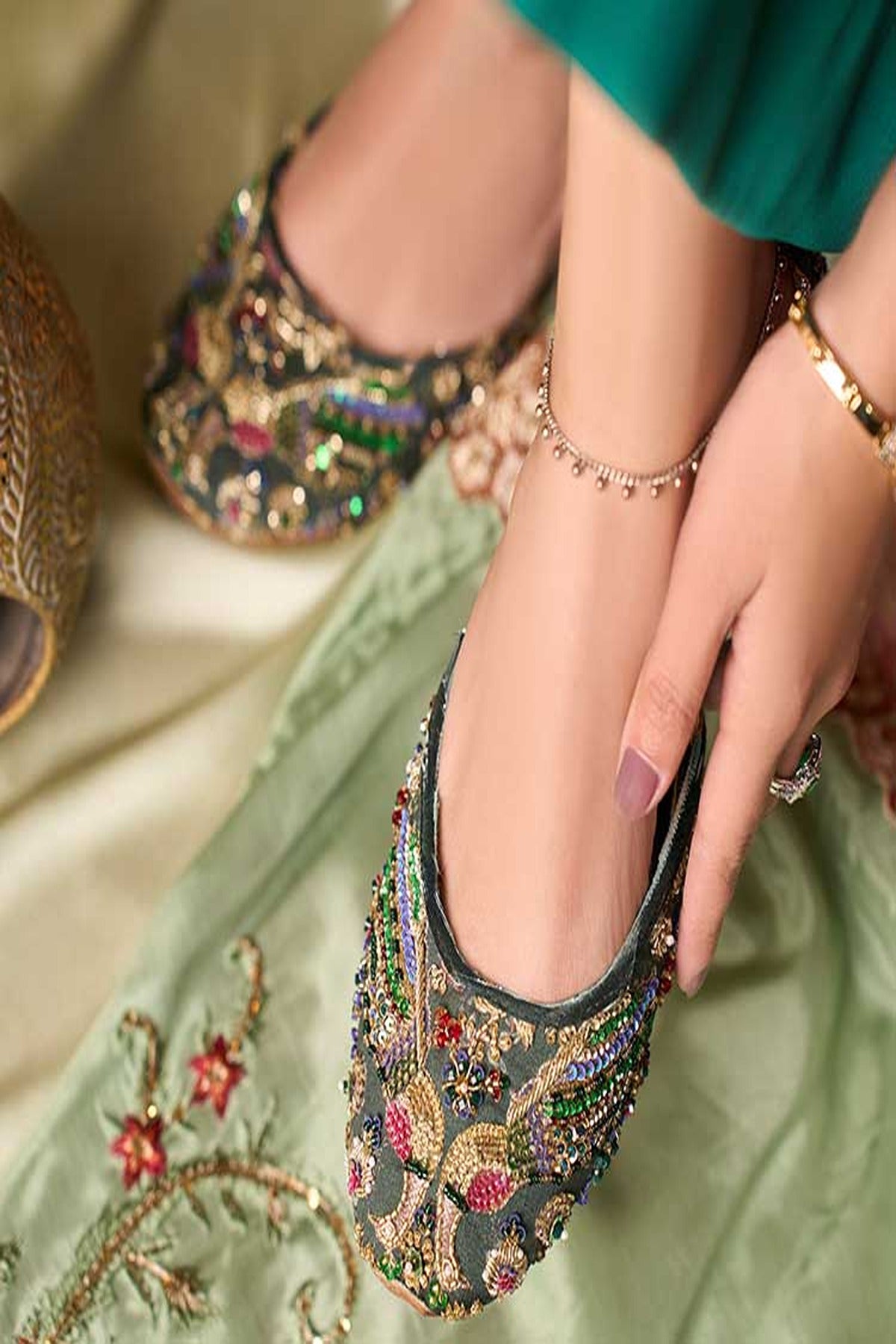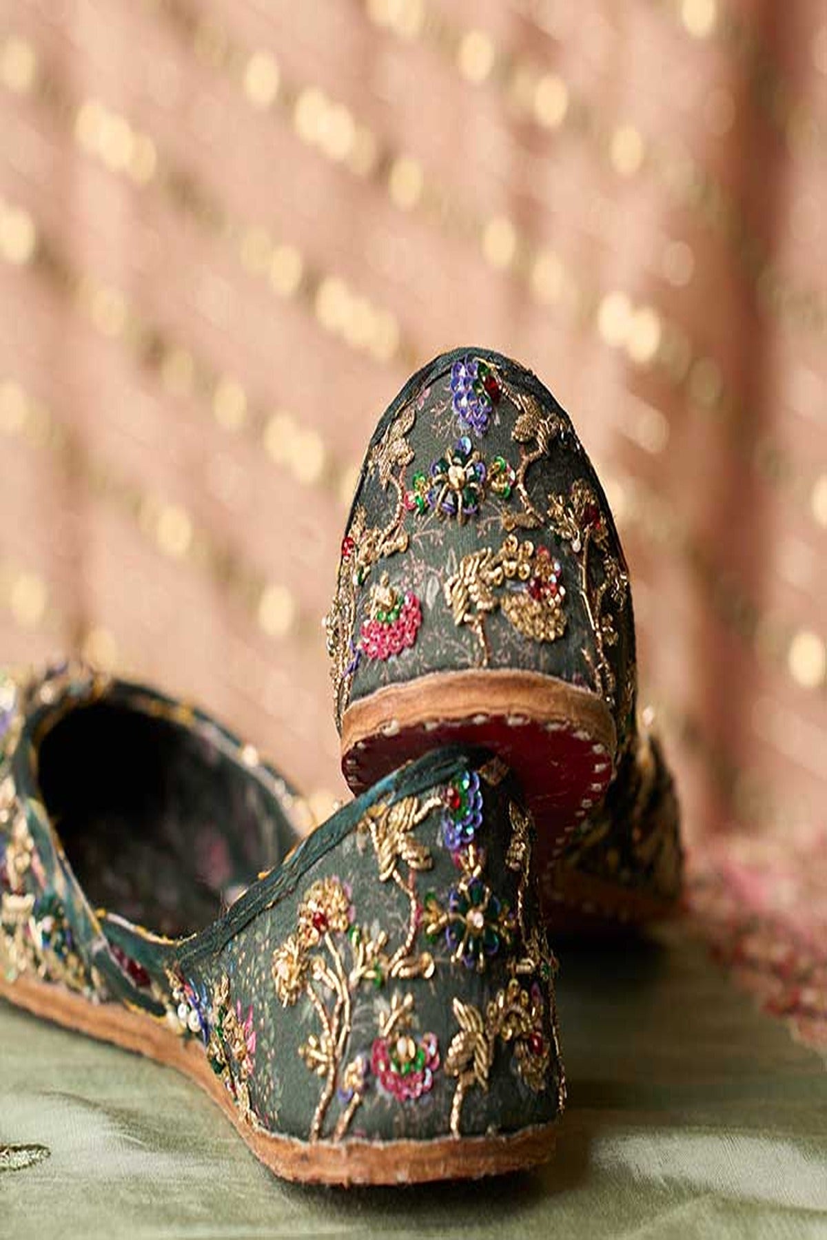 “Zebunnisa” is embellished with elaborate beading and vivid flower motifs, bringing the beauty of nature to your feet. For people who enjoy a distinctive touch in their shoes, the clash of colors and textures produces an eye-catching appeal.