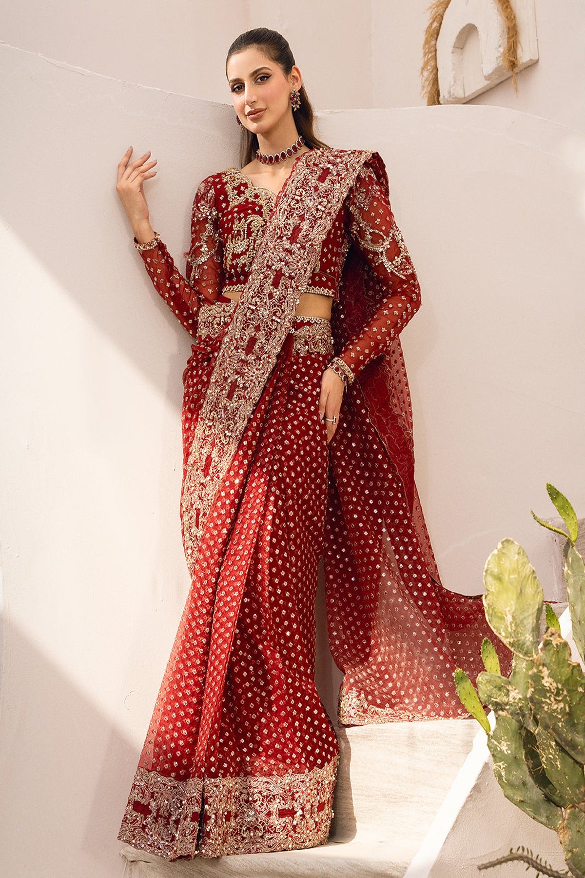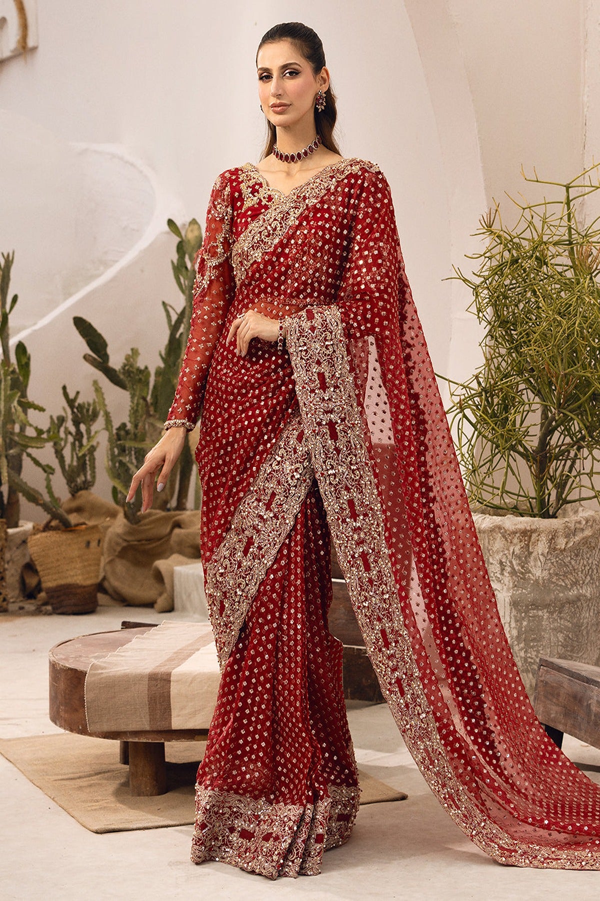 - Paired with a breathtaking red blouse, this ensemble takes grandeur to the next level. The handcrafted blouse is embellished with shimmering pearls and beads, creating a dazzling contrast against the rich maroon of the saree. Each detail on the blouse is thoughtfully designed.